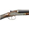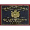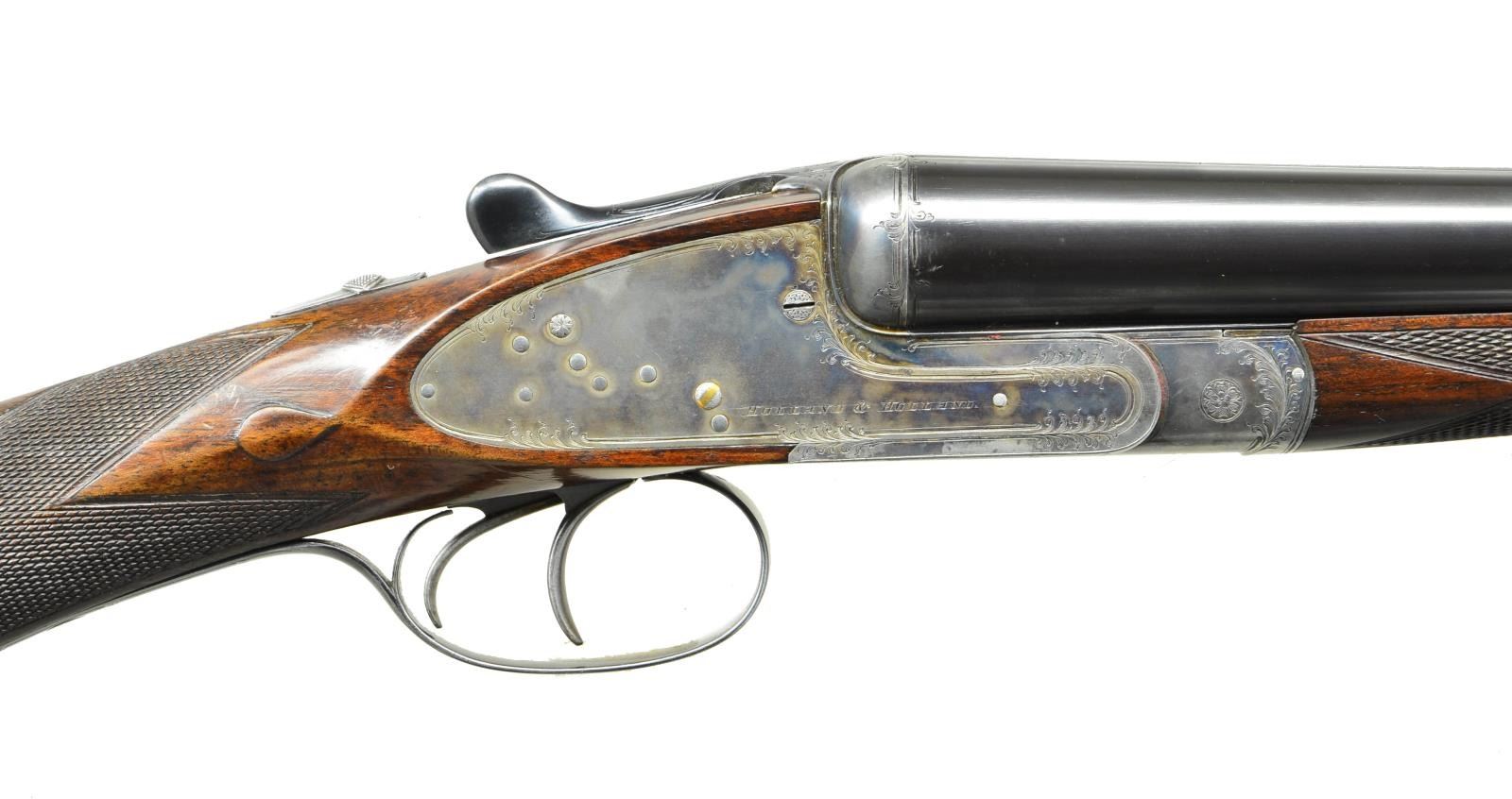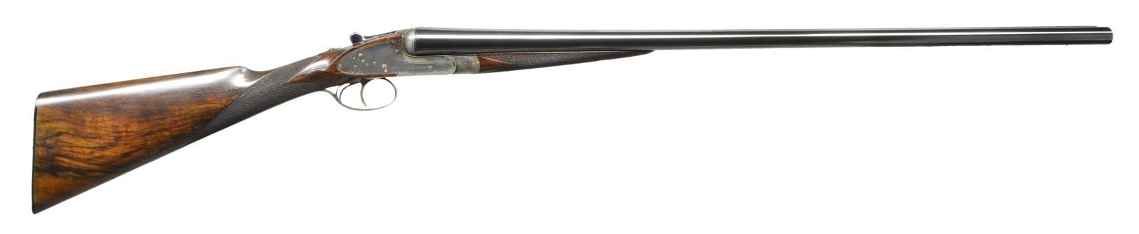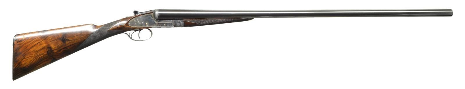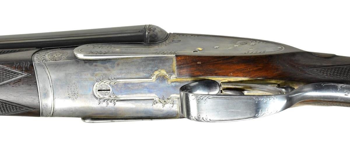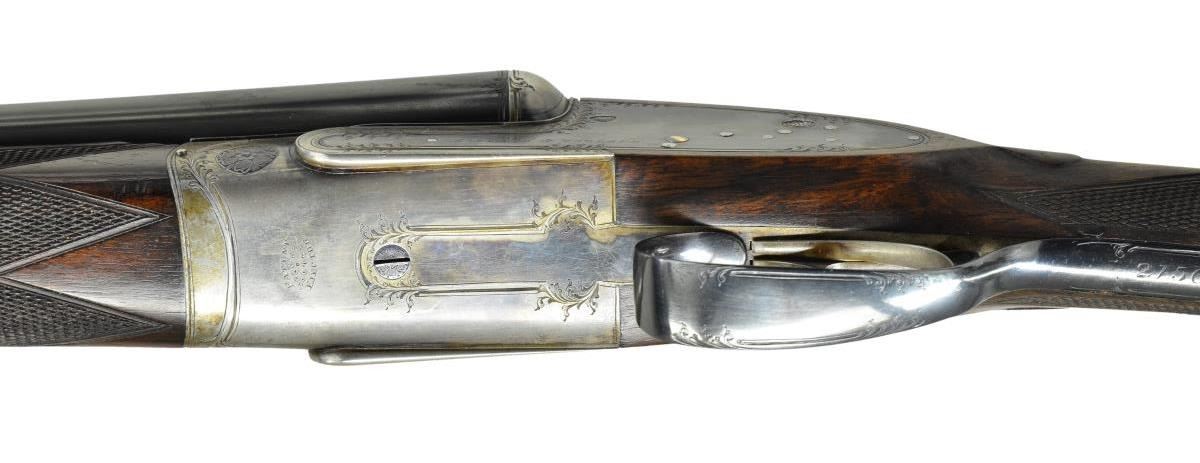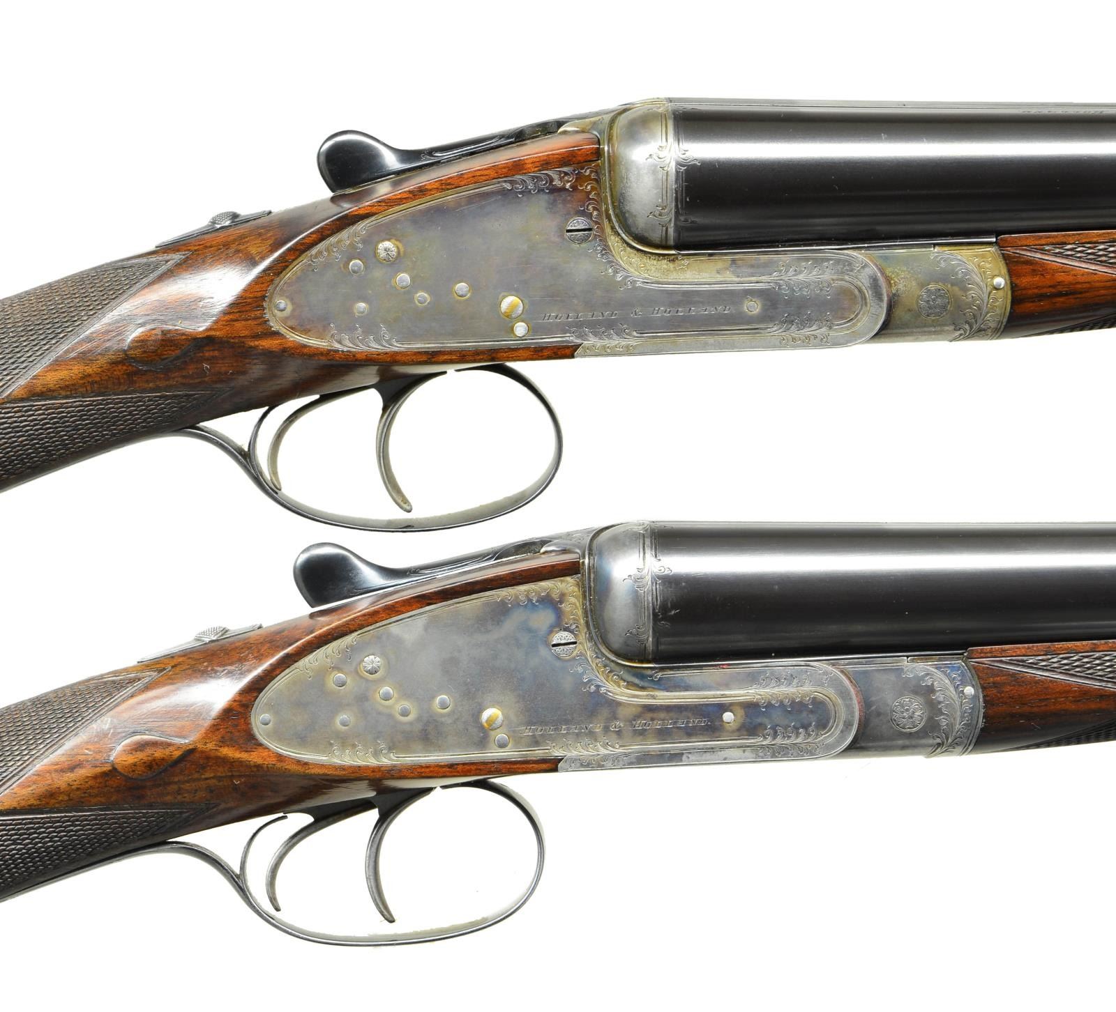 GRADE “B” OR “2” SIDELOCK EJECTOR GAME GUNS WITH ORIGINAL CASE AND ACCESSORIES. Cal. 12 Ga., 2 1/2". S# 21564, 21565. Bbls. 30". The Grade B or No. 2 was Holland & Holland's 2nd grade, one step under the “Royal” & is nicely finished but simply does not have as much embellishment. This pair of guns have 30" dovetailed steel bbls. fitted w/ narrow swamped game ribs, the numbers “1” & “2” are gold inlaid respectively on breech ends, as well as on top levers & forend latches, denoting a true pair. Bbl. tops are stamped w/ “Holland & Holland” & “98. New Bond Street. London”. Bbl. flats are stamped w/ London nitro proofs 2 1/2" chambers. S#s are on the bottom of each bbls. Bottom of each left bbl. is engraved “B GRADE”. Case hardened Royal pattern sidelock actions are fitted w/ non automatic safeties (“Safe” inlaid in gold), gold band tumbler end cocking indicators & dbl. triggers. Actions are engraved in Grade B or No. 2 style w/ splashes of well cut scroll as counter point to line borders. Beads are nicely filed. Each lockplate is engraved w/ maker's name. Bottoms of actions are engraved “Patent” “Ejector”. Blued top levers & triggerguards are engraved to match. S#s are on triggerguard tangs. Well streaked & lightly figured European walnut straight grip buttstocks that match very well, measure 13 3/4" over ribbed horn buttplates & feature drop points, point pattern checkering w/ mullered borders on diamond hands & vacant silver ovals on toelines. Matching splinter “AB” ejector forends have inlet steel tips & Deeley type releases. MEASUREMENTS: (S# 21564) BORE DIAMETER: .729 left, .729 right. BORE RESTRICTIONS: .007 IC left, .002 IC right. WALL THICKNESS: .023 left, .026 right. DAC: 1 5/8". DAH: 2 13/16". Cast: off 1/2". WEIGHT: 6 lbs 9 oz. (S#21565) BORE DIAMETER: .729 left, .729 right. BORE RESTRICTIONS: .009 left IC, .002 right IC. WALL THICKNESS: .025 left, .027 right. DAH: 2 13/16". DAC: 1 5/8". Cast: 1/2" off. WEIGHT: 6 lbs. 8 oz. UNATTACHED ACCESSORIES: guns are housed in their original 2 gun oak & leather case w/ brass corners. A brass plaque on top is engraved “Gioacchino Del Balzo”. Case is lined in scarlet cloth & has gold embossed black leather Holland & Holland label in lid along w/ charge card for these particular guns & “AB” ejector maintenance card. Bottom compartment is separated by a folding dust leaf & has space for both guns & their bbls. Case contains 2 pair of Holland & Holland marked snap caps, 2 pull through cleaning kits in black Morocco wallets & another leather wallet containing spare strikers for both guns. Another covered compartment holds Mop, Jag & Turks head. An open compartment holds a leather carrying sling. CONDITION: very fine, mostly original, “as found”. Both sets of bbls. retaining nearly all of a professional reblack; engraving somewhat softened. Action & lockplates retain approx. 70% original case hardening color silvered on high edges, beads & fences. Thinning somewhat at bottoms & sides from normal hand wear. Lock plates retain over 80% of their color. Top levers & trigger guards reblued, engraving softened. Stocks retain nearly all of their original rubbed oil finish w/ a good scattering of light marks & some areas dulled. Checkering lightly worn. Bores are bright & shiny w/ a few minor striations in right bbl. of gun #2. Actions are tight. Bbls. are on face. AB ejectors are typically strong & in time. Case leather is still relatively light in color has numerous bumps & rubs & has some water stains. Straps & handle are good. Interior cloth shows some soiling & rubs but is generally fine. Leather label shows some mildew. Paper labels are good but somewhat foxed. Lower compartment partitions are solid. Cloth has some rubs through along w/ marks & stains, but is generally very good. Accessories are good. (22-4994 & 22-4995/MGM). CURIOS. $8,000-12,000.