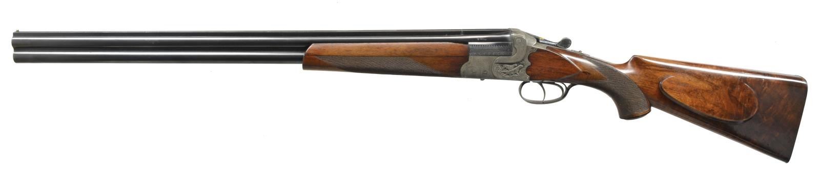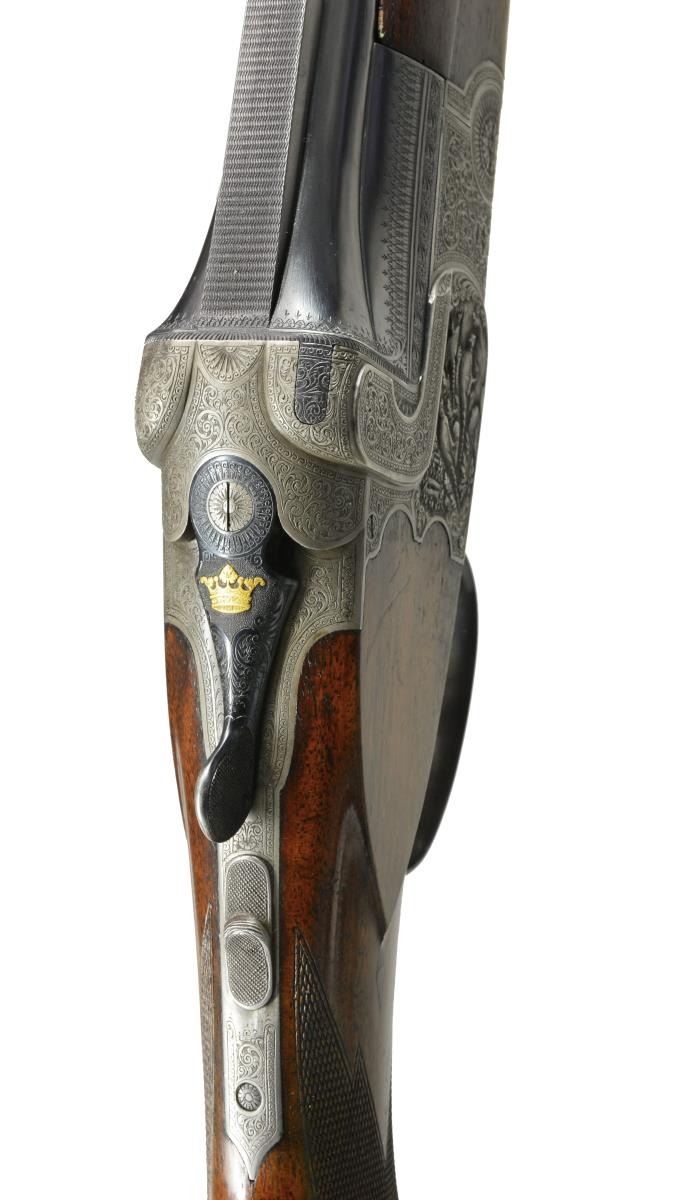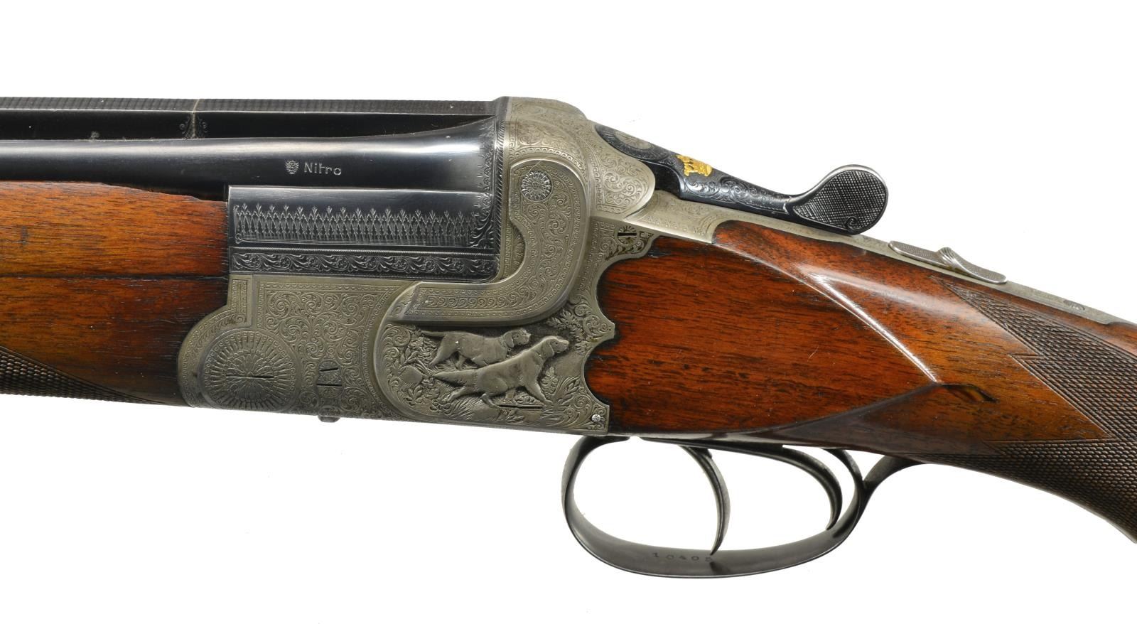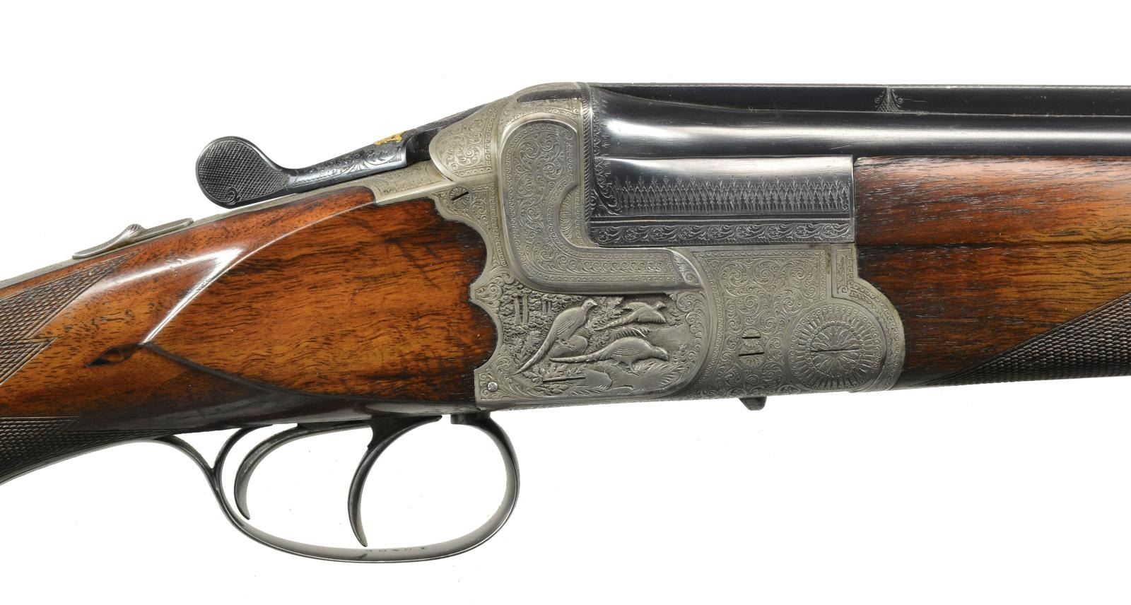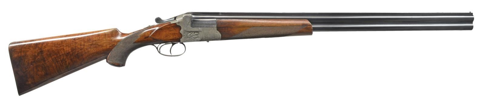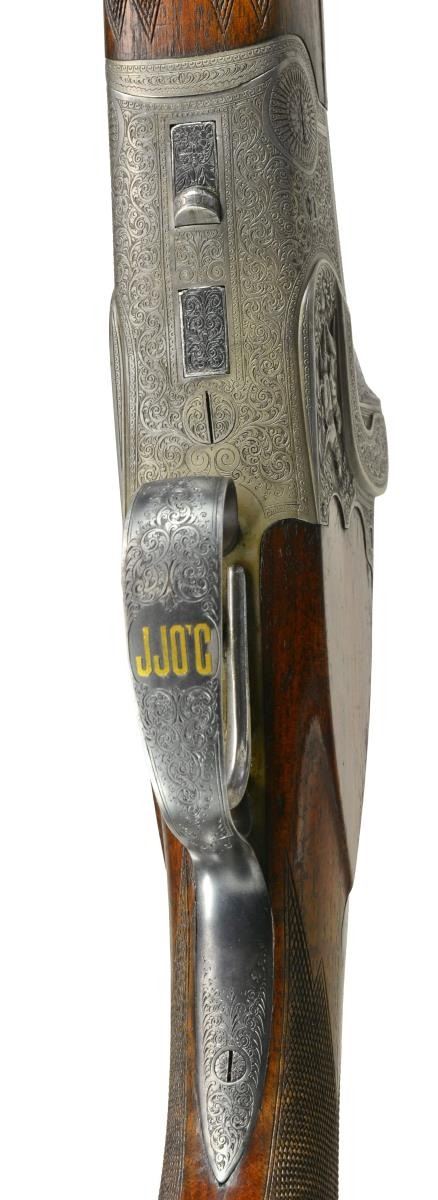 & HOWE, ONCE THE PROPERTY OF NORRIS MORGAN W/ CORRESPONDENCE PERTAINING TO THIS GUN FROM SEYMOUR GRIFFIN. Cal. 12 Ga., 2 5/8". S# 10405. Bbls. 26 3/4" demibloc & are engraved "GRIFFIN & HOWE INC. NEW YORK AGT." in milled out portion of full length solid matted rib. Left sides of bbls. are stamped w/ German nitro proofs, proof date of 6/25 & "ROECHLINGS" "ELEKTROSTAHL". Bbl. flats stamped "GERMANY". French gray single Kirsten scalloped back boxlock o/u action features non automatic safety ("SAFE" inlaid in gold) & dbl. triggers. Front of action is stamped "GERMANY" & action engraved w/ near full coverage well cut varying sized shaded scroll w/in scroll & line borders. This fine scroll surrounds very well detailed full relief sporting vignettes on sides; a pair of setters on left side & trio of pheasant in woodlands on right. There is no actual maker's name or logo evident on bbls. or action. Blued top lever is inlaid w/ a duke's crown in gold. Steel trigger guard is gold inlaid "J.J. O'C" flanked by scroll on bow. Nicely figured dense European walnut, horn capped pistol grip buttstock measures 14 1/4" over French gray scroll engraved steel buttplate. Stock features shadowline right hand cheekpiece, closely spaced point pattern checkering at grip, & flush diamond shaped horn drop points behind side panels. Matching 1 piece forend w/ inlet horn tip has Deely release. MEASUREMENTS: BARRELS: Bore diameter: O .718 U .718. Restriction: O .045 (EXTRA FULL) U .039 (FULL). Min. Wall Thickness: O .018 on right side near top rib, approx. 12" back from muzzle. U .018 sm. area left side behind choke. Otherwise both bbls. measure .022-.025. STOCK: LOP: 14 1/4". DAC: 1 1/2". DAH: 2 3/4". Cast: Neutral. WEIGHT: 6 lbs. 14 oz. UNATTACHED ACCESSORIES: accompanying gun is a 4 page letter from Seymour Griffin to the Morgans w/ his recollections regarding this gun, Norris Morgan's inventory sheet & paperwork, & a copy of the "Illuminator" journal (cover photo removed) where this gun is pictured. CONDITION: fine original "as found". Bbls. retaining over 80% of what appears to be original blue, silvered on sharp edges, thinned overall. Action retains approx. 90% original French gray w/ no noted areas of staining. Stocks retain over 90% of their original hand rubbed oil finish w/ some oil darkening behind action & a number of scattered marks. Finish wearing thin on forend, checkering lightly worn. Action is tight, mechanically fine. From Norris Morgan's notes, it appears this gun was used by his wife Arlene for trap shooting. (20-1672/MGM59). CURIO. $3,000-6,500.