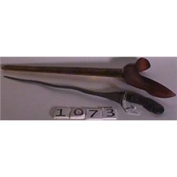 FINE INDONESIAN KRISS, late 19th/early 20th century, having a meteorite blade, with figured wood and embossed brass sheet scabbard; 20 inch length