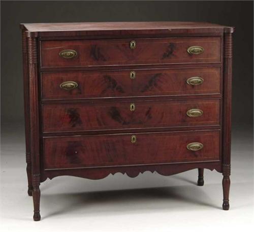 FINE INLAID SHERATON FOUR DRAWER CHEST. North Shore, Massachusetts chest has reeded and turned corner columns ending in high turned legs. The shaped top over four drawers having mahogany veneered fronts with line and band inlay. Nicely carved skirt in its original finely alligatored surface. Original oval bale brasses, two of which are missing and one bale missing. SIZE: 38-3/4” h x 42-1/4” at widest x 20-1/4” at deepest. CONDITION: Very good, outstanding original surface. 9-26570