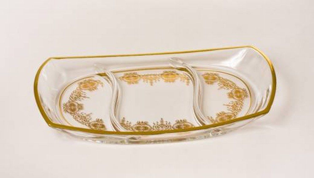 FINE ITALIAN CRYSTAL SECTIONAL SERVER - HAND PAINTED 14 KT GOLD DESIGN - 13L" x 9.5W" x 4H"