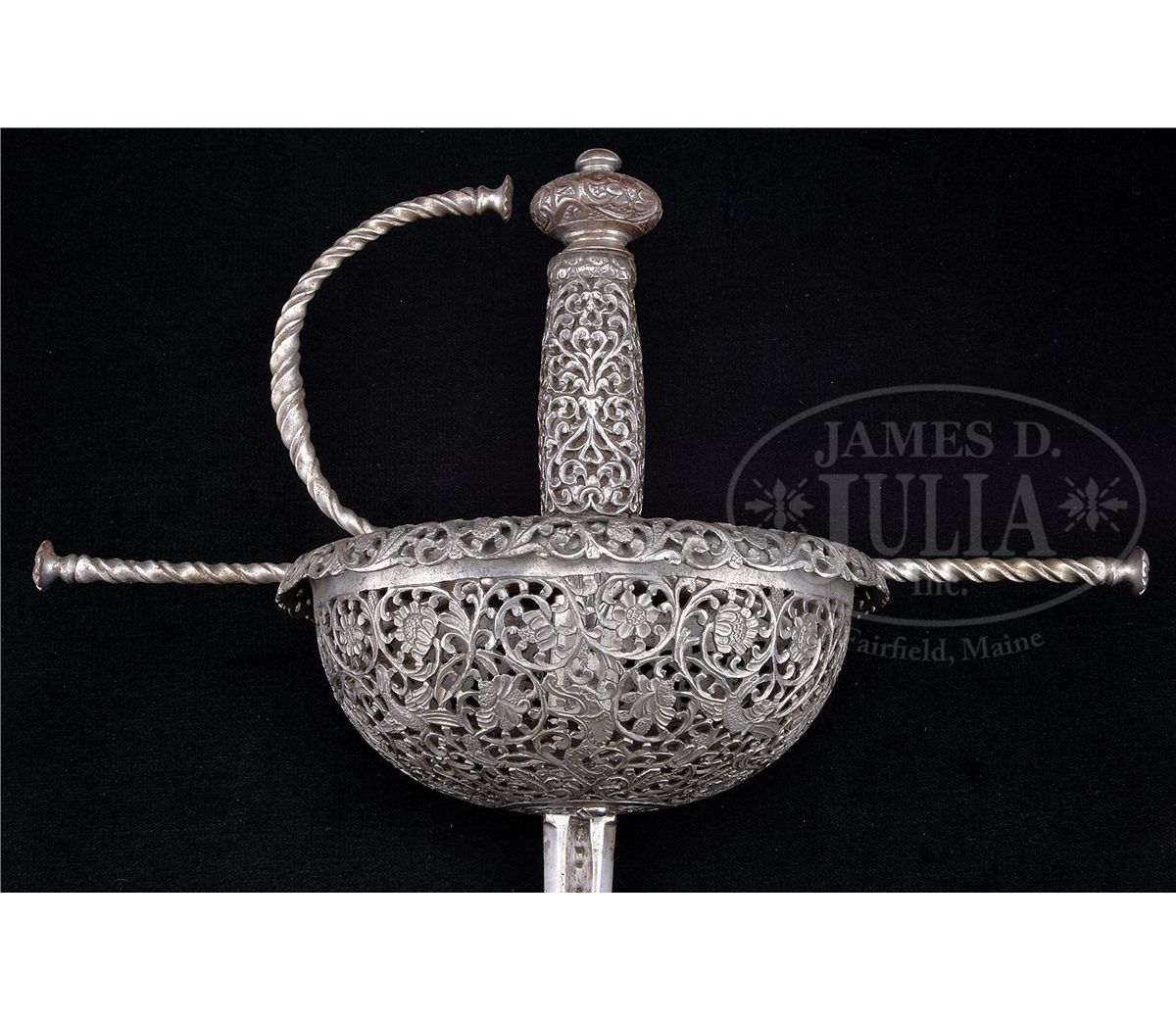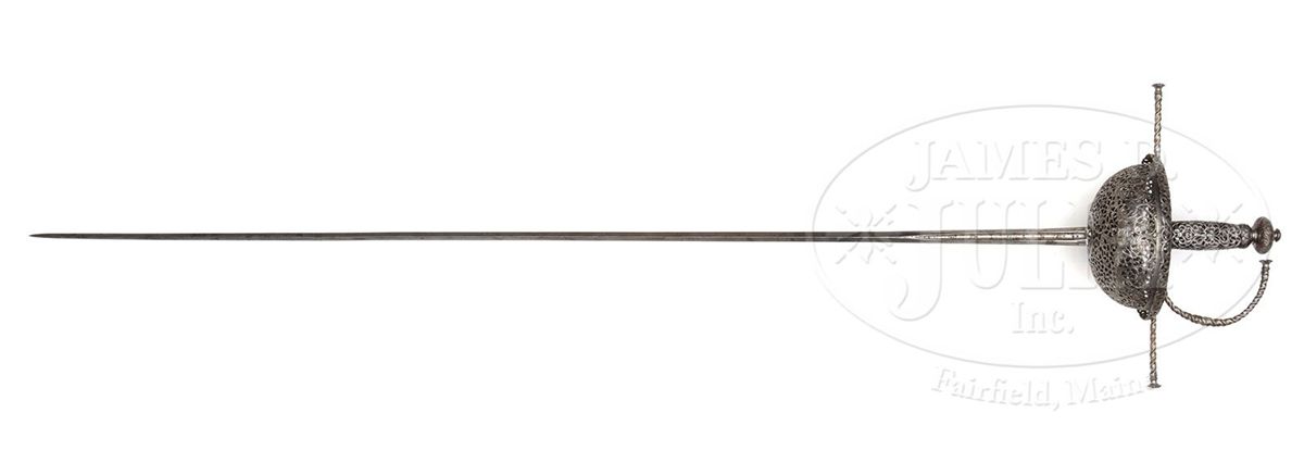 NSN. Cup elaborately pierced in the Brescian manner with monsters, birds and flowers. Guardapolvo pierced en suite and intact. Guard and quillions of writhen steel. Pierced grip and steel Turk's heads. Solid pommel chiseled with flowers en suite with guard. Long lozenge-shaped blade with short fullers marked Solingen. Balance is perfect. An extremely similar example, possibly this very piece is illustrated in Stone's glossary under the rapier heading. Deaccessioned from the Metropolitan Museum of Art, New York City, sold at Parke Bernet Galleries, New York, 1956. PROVENANCE: The Metropolitan Museum of Art, New York City. CONDITION: Overall very crisp for an all steel sword of this period and type. 4-49158 MRZ71