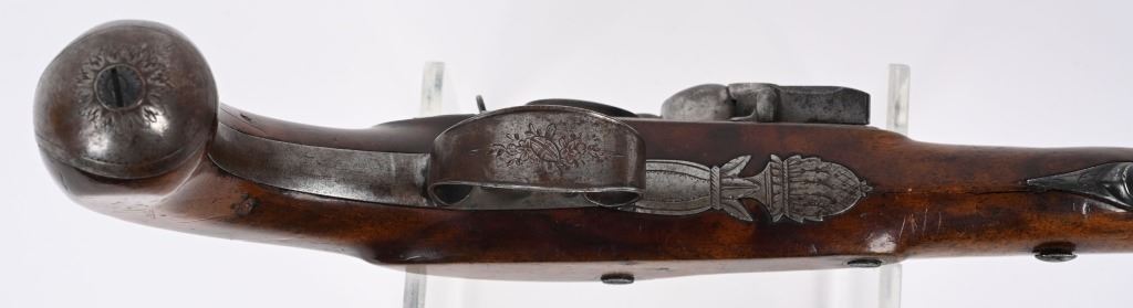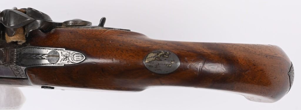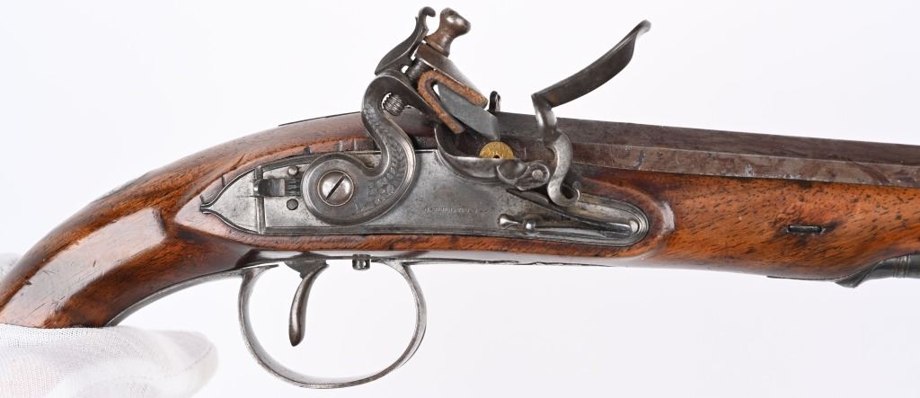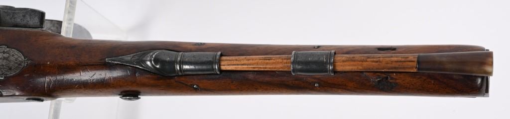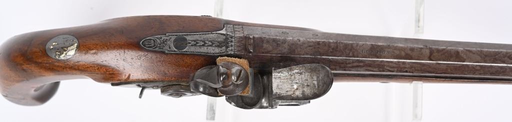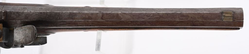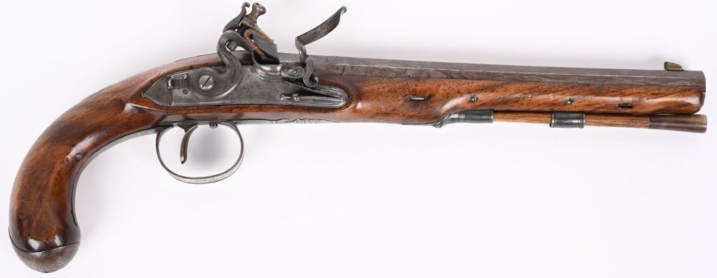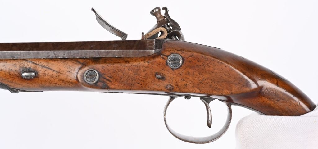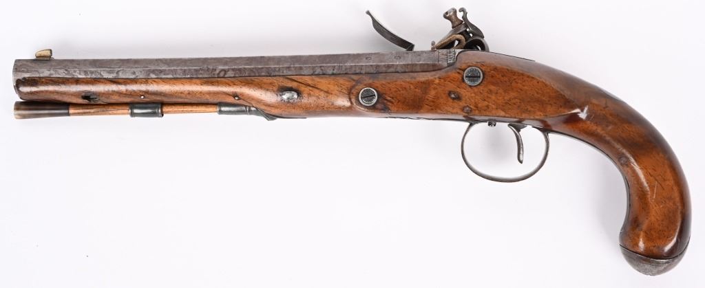 John Probin, Maker to His R H The prince of Wales. Gun Maker, 29 Lisle St., Leicester Square, 1826-41. Features a 9.5" octagon barrel in 58 bore, not rifled. Full length walnut stock. Lock stamped R. Probin. Barrel stamped London with two proof marks on left breech. Engraved screw heads, upper tang, trigger guard and pommel. Condition. Smooth patina with razor sharp legends. Stock is excellent with one closed hairline at base period horn tip ramrod. Excellent bore. Fine working order. Not even any burn or corrosion in pan or touch hole. ANTIQUE