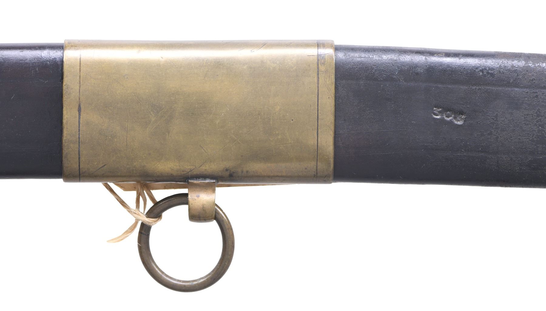 CAPT JOHN A. JACKSON, 38th ALABAMA. James Conning made beautiful Staff & Field officer's swords and this fine example has all the Conning characteristics: matching assembly/serial numbers "306" on blade, and scabbard. The hilt is Confederate copy of US model 1850 with "CS" pierced in floral guard. Original & correct Conning scabbard has braised posts to hold sword rings. Throat is inscribed "Made by / James Conning / Mobile".