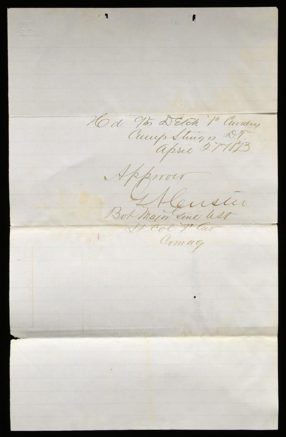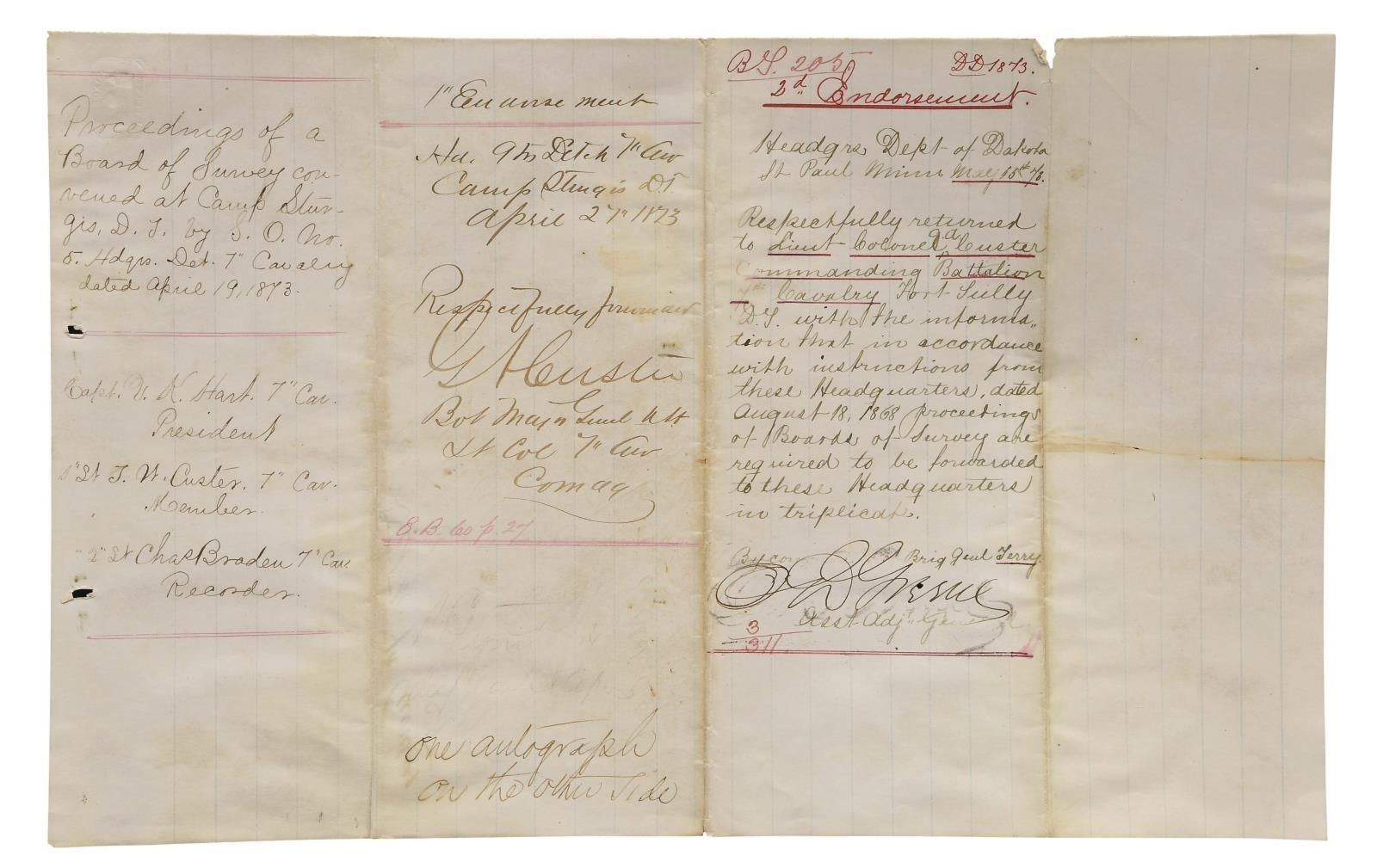 SIGNED "G.A. CUSTER, BREVET MAJOR GENERAL USA, LT. COL. 7TH CAV" CAMP STURGIS, DAKOTA TERRITORY, APRIL 27, 1873. From direct decent of Libbie Custer, "Proceedings of a Board of Survey" convened at Camp Sturgis, D.T. by S.O. no 5, Hdqrs Det. 7th Cavalry dated April 19, 1873. Custer was completing 350 mile march up Missouri River. He appears happy to finish paperwork of this survey as on verso signs with massive autograph endorsement panel about 4" x 5". The body of document has another "G.A. Custer" signed endorsement, along with AAG signing for Brig. Gen. Alfred H. Terry, commander of the Dakota Territory, explaining that the report is "Respectfully returned to Lieut. Colonel GA Custer commanding Battalion 7th Cavalry Ft. Sully, Dakota Territory. AAG underlines in bold red ink somewhat harsh comments apparently intended to remind Custer of his place in the chain of command. Custer would always skirt the chain of command, being temporarily arrested 2 months later. We all know what happens when you don’t follow chain of command when chasing hostile Indians. Rarely do we see brevet ranks signed above actual ranks in field service documents. Custer's brevet rank of major general may have been done to annoy Brig Gen. Alfred Terry who did not out rank him during the Civil War. Regardless, this is a wonderful document with the finest & boldest General George Custer autograph probably extant. There was a reason for Libbie to have retained it her whole life. CONDITION: very good, 2 small file holes at top of page, light soiling, light damp staining, edge and fold wear including nicks at fold edges. PROVENANCE: General George A and Elizabeth Custer; Margaret Flood (Libbie Custer's personal assistant); Spink Smythe, lot 1082, August 22, 2012; Martin Lane Western Americana Lifetime Collection. (02-21896/JS). $4,000-5,000.