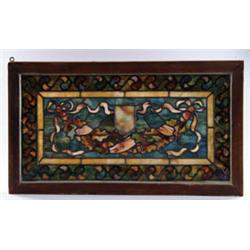 Lot 550 FINE LEADED WINDOW ATTD. TO TIFFANY Beautiful leaded glass window has wonderful natural design with swirling border and center panel depicting a spray of oak leaves and acorns tied with a ribbon at the corners. Top of ribbon flows into center shield. Centers of bows and acorns are adorned with heavy chunk jewels known to be used by Tiffany. Background glass and center panel is swirling colors of blues, grays and greens with a tight mottling reminiscent in glass found in Tiffany lamps. Backside of window has slightly iridescent blue and purple glass plated around the border and the center shield is plated with a light blue opalescent glass. Window is unsigned, but attributed to Tiffany. Framed in an oak frame, may not be original to window. SIZE: Overall is 29" x 16-1/2". Window itself is 26" x 13-1/2". CONDITION: Very good to excellent with only a few hairlines. 5-70893