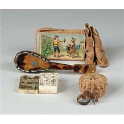 FINE LOT OF FRENCH FASHION SHOES AND ACCESSORIES. Included in this lot is a pair of fashion boots (2”), a box containing miniature Dominoes, a lute, picnic basket, and miniature sewing basket. SIZE: Varies. CONDITION: Overall very good plus; lute lacking strings. JL 1-4563 (200-400)