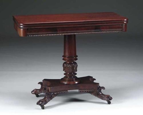 FINE MAHOGANY PHILADELPHIA CARD TABLE. The rounded corner flip over top above a mahogany veneered frieze with gadrooned edge. The center column with large leaf carved hub and ring turning. Quatrefoil base with four winged paw feet on original casters. PROVENANCE: From a fine Hallowell, Maine Estate. CONDITION: Very good. 9-27027