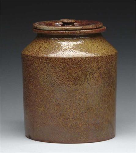 FINE MAINE REDWARE GLAZED COVERED JAR. Cylinder shaped jar with beveled neck and flat rim has a wonderful greenish glaze with red speckling inside and out. Matching cover has small round finial. A wonderful piece of Maine redware. PROVENANCE: Ex-Ross Levett. SIZE: 8” h x 6-1/4” dia. CONDITION: Very good. 9-27562