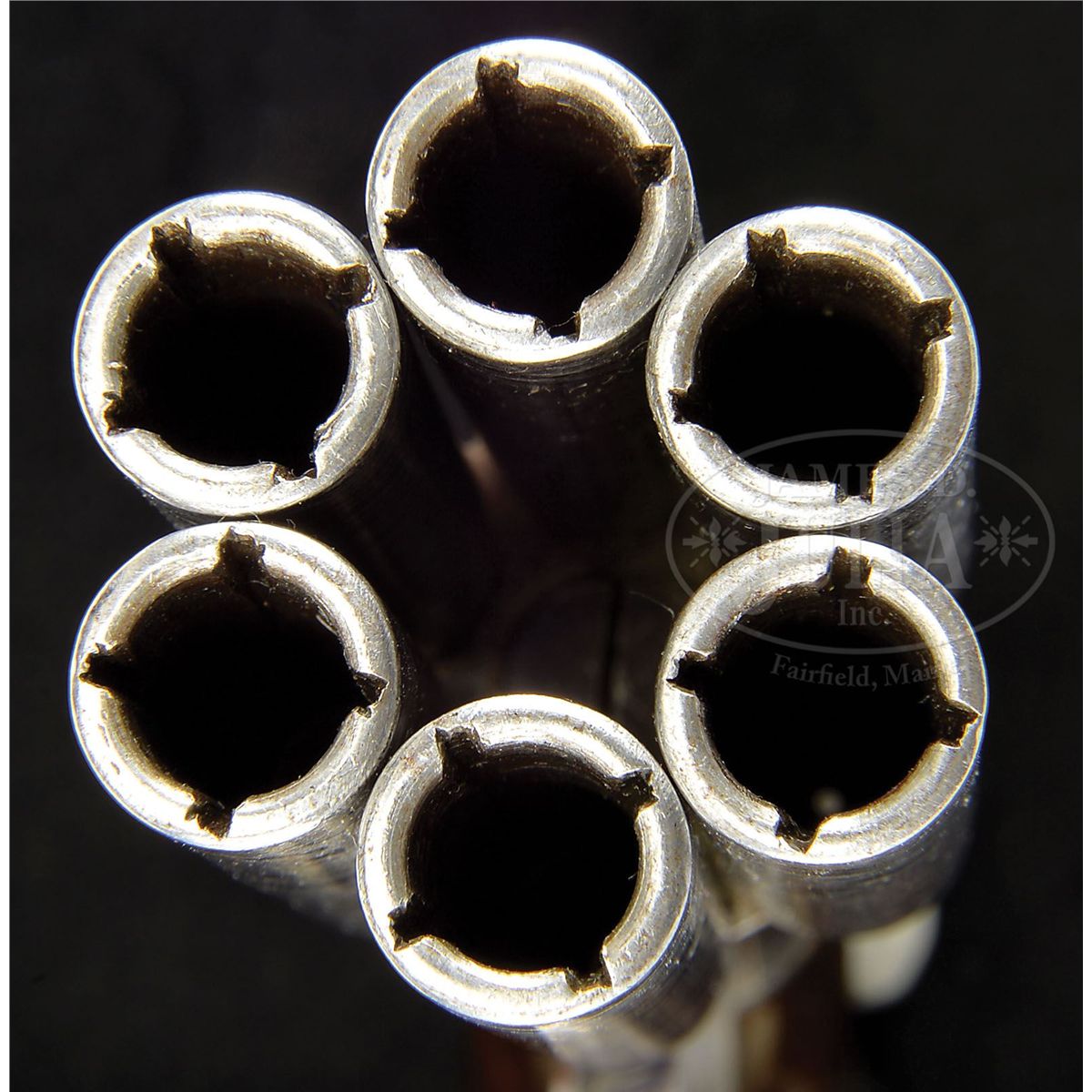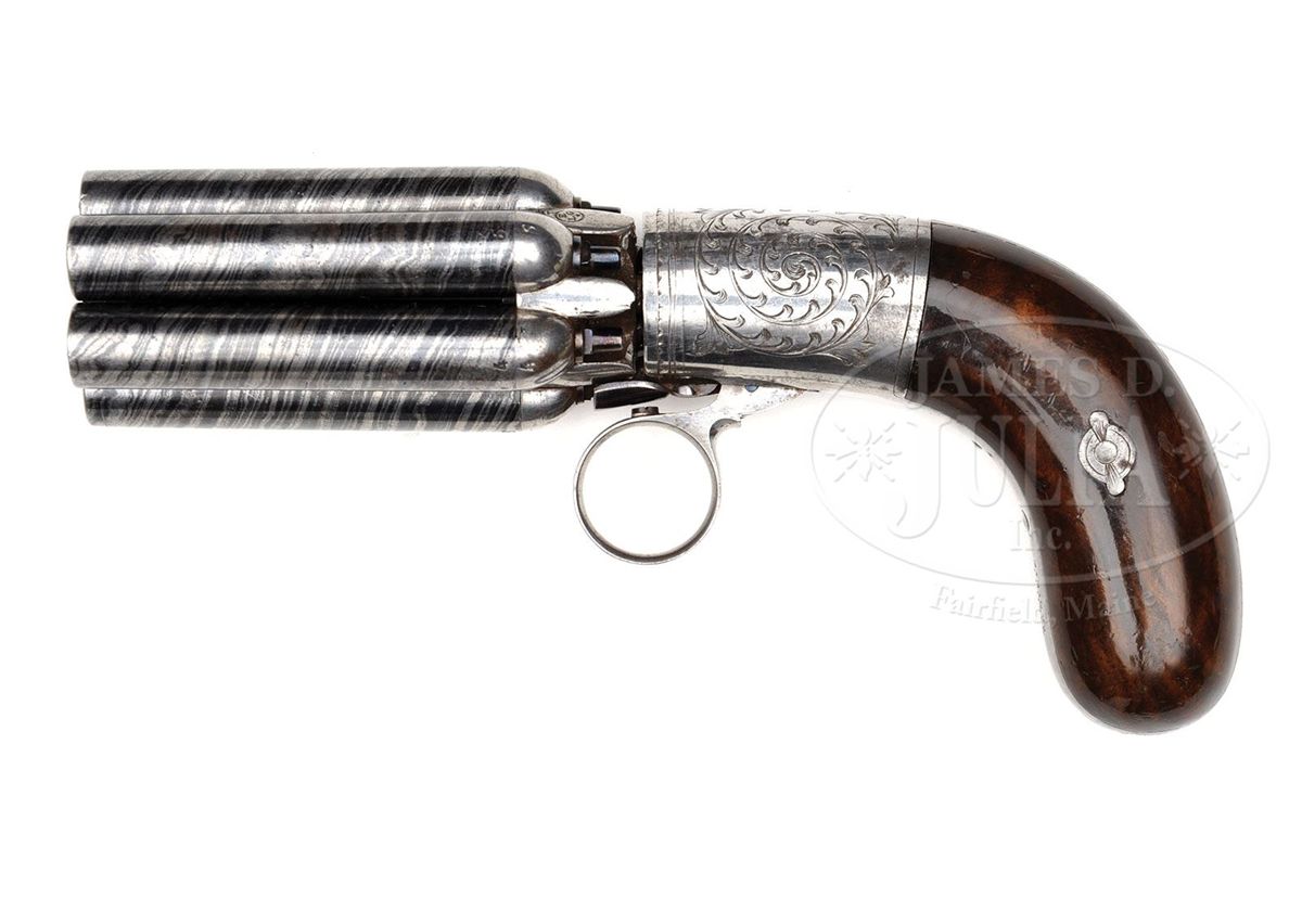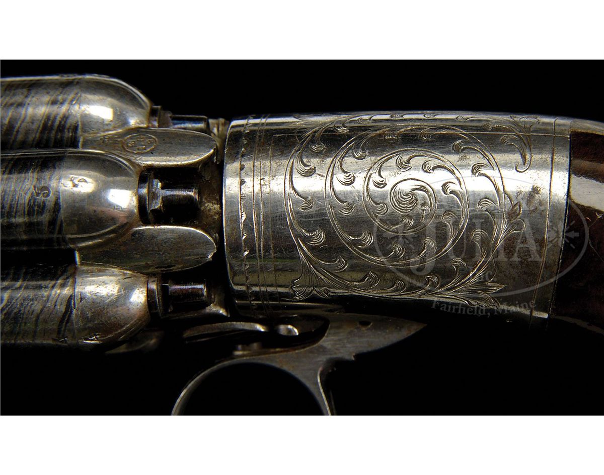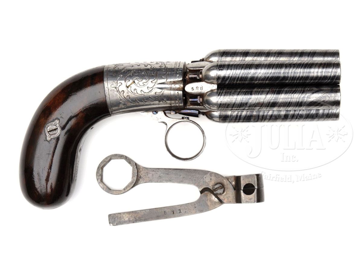 SN 528. Cal. about 38. Beautiful Belgian Pepperbox with 2-5/8" six-bbl cluster. Bbls are damascus and individually mounted into the rotating wheel and are numbered 1-6. It has rnd frame with 2-pc, highly figured bag-shaped walnut grips and a ring trigger. Frame is nicely engraved in foliate arabesque patterns which also extend down the backstrap. Front strap is marked with the makers name. Accompanied by its orig nutcracker style single-cavity ball mold with sprue cutter. One arm of the bullet mold is an octagonal bbl wrench for another style of pistol and the other arm is a square nipple wrench which also functions as a bbl wrench which fits into the 4 grooves of the bbl. CONDITION: Extremely fine. Bbls retains virtually all of their silver and blue damascus pattern. Nipples retain virtually all of their orig blue. Frame retains strong orig polish, dull on the front and backstraps. Grips are sound with a few light nicks & scratches and retain most of their orig varnish. Mechanics are fine. Bright clean bores. Mold is fine. 4-48629 JR416