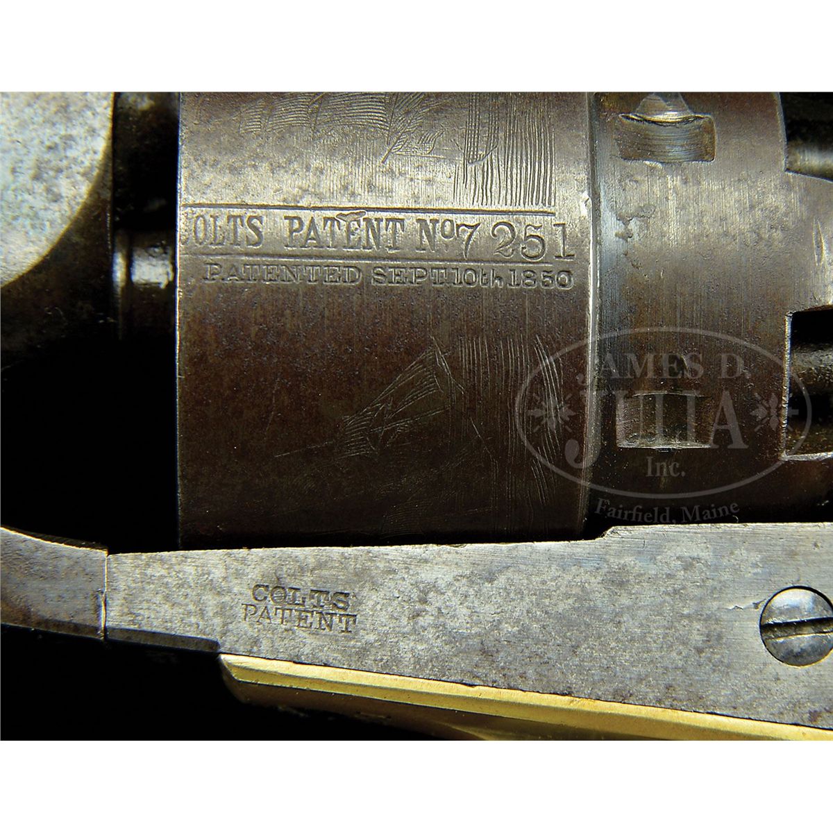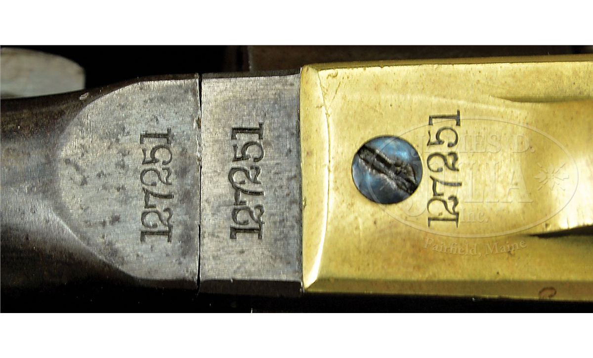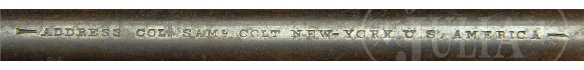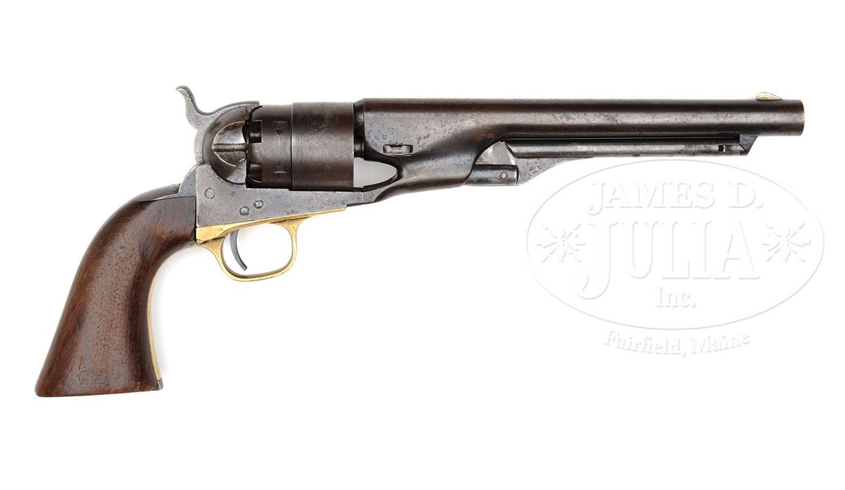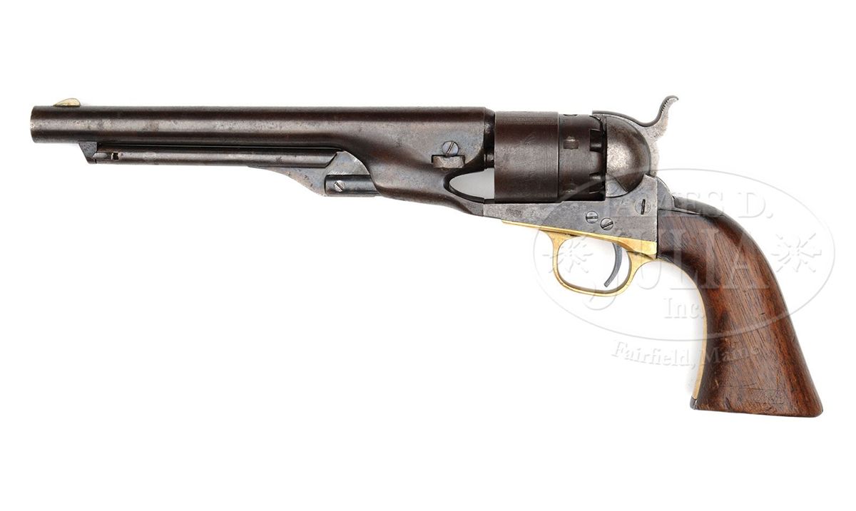SN 127251. Cal. 44. This is a fine example of a mid-war US Cavalry purchased Colt Army revolver. Blue & color case hardened with 8" rnd bbl, German silver front sight and 1-line U.S. America address. Frame has a tiny "COLTS PATENT" on left side and is 3-screw style, cut for shoulder stock, with flathead hammer screw. Cyl is usual rebated style with 6-chambers and Ormsby Naval battle scene roll marking. All of the safety pins are serviceable. The brass trigger guard & iron backstrap contain a 1-pc walnut grip. Both sides of grip have legible cartouches and several of the metal parts have tiny inspector initials. According to Flayderman's Guide to Antique American Firearms about 127,000 Model 1860 revolvers were purchased by the Federal Government for use in the Civil War. The majority of these revolvers were issued to front line troops and was the most extensively used handgun throughout the Civil War. They mostly saw continuous service throughout the war and later on the American frontier, usually under harsh conditions with limited or no maintenance and are rarely found today with orig finish or with fine visible cartouches. CONDITION: Very good to fine overall, all matching including cyl and wedge. Bbl retains 10-20% orig blue with much of balance plum with scattered staining and pitting. Rammer & handle retain traces of bright case colors; frame and hammer retain traces of orig case colors with balance gray/brown with pitting. Cyl retains traces of blue finish and shows about 98% Ormsby Naval battle scene; trigger guard is a medium mustard patina, never having been silver plated; backstrap & buttstrap retain about 20% orig blue with the balance plum with light patina. Grip is sound showing moderate edge wear, a few nicks & scratches and retains a hand worn patina with about 1" "cut out" area on right side near frame and small chips on each inside toe and small gap between stock and frame. Mechanics are fine, well defined crisp bore. 4-48811 JS222