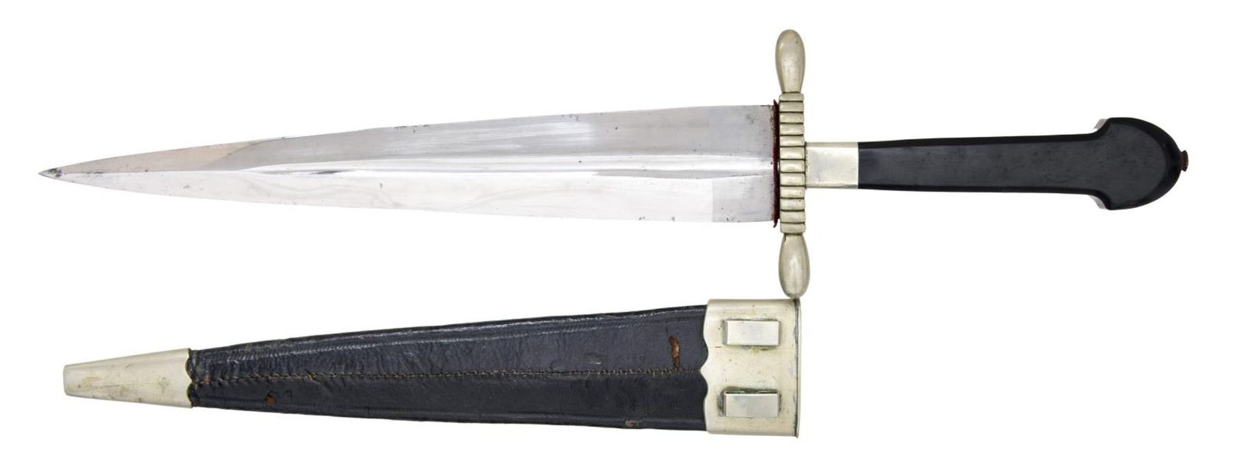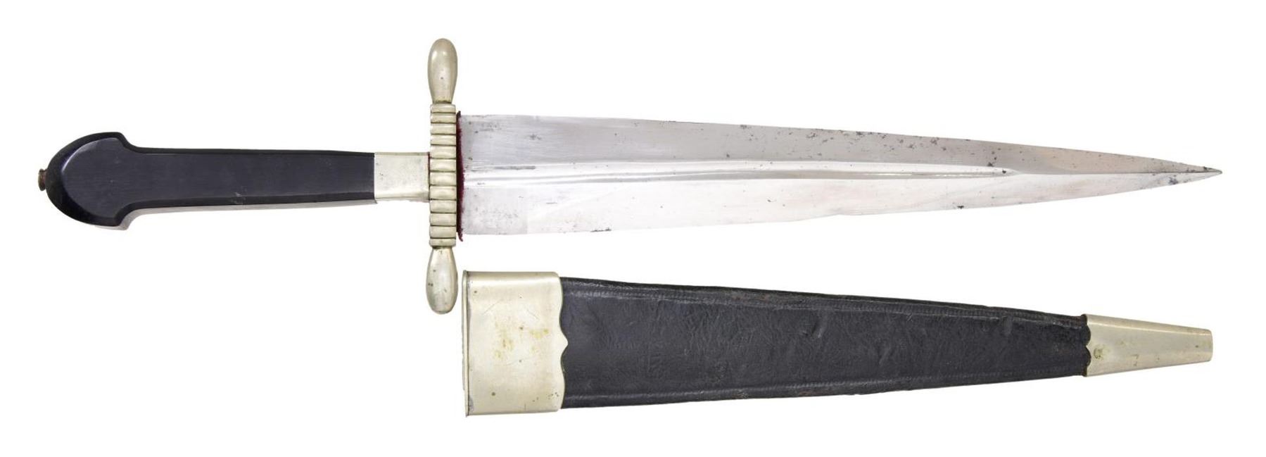 17" overall, 11.25" double edged 1.75" central narrow fullered rapid taper dagger point. Sculpted heavy German silver crossguard, German silver ferrule fitted to flared pommel ebony handle with capstan rivet. Double layer leather sheath has heavy German silver tip and throat with pair of .75" belt loops. English style, late 19th century. CONDITION: fine overall, blade is excellent retaining virtually all of its original polish with small areas of staining and pitting at tip. Sheath fits well, German silver throat is loose, 1 small hole in black dyed sewn outer layer of sheath. (02-22459/JS). $2,000-2,500.