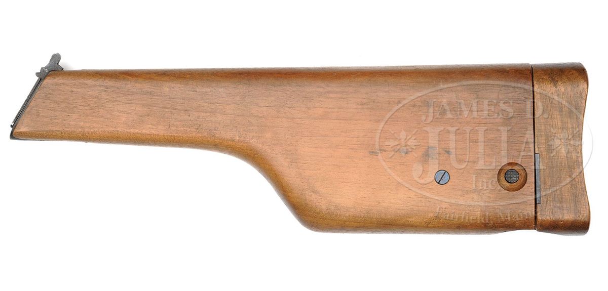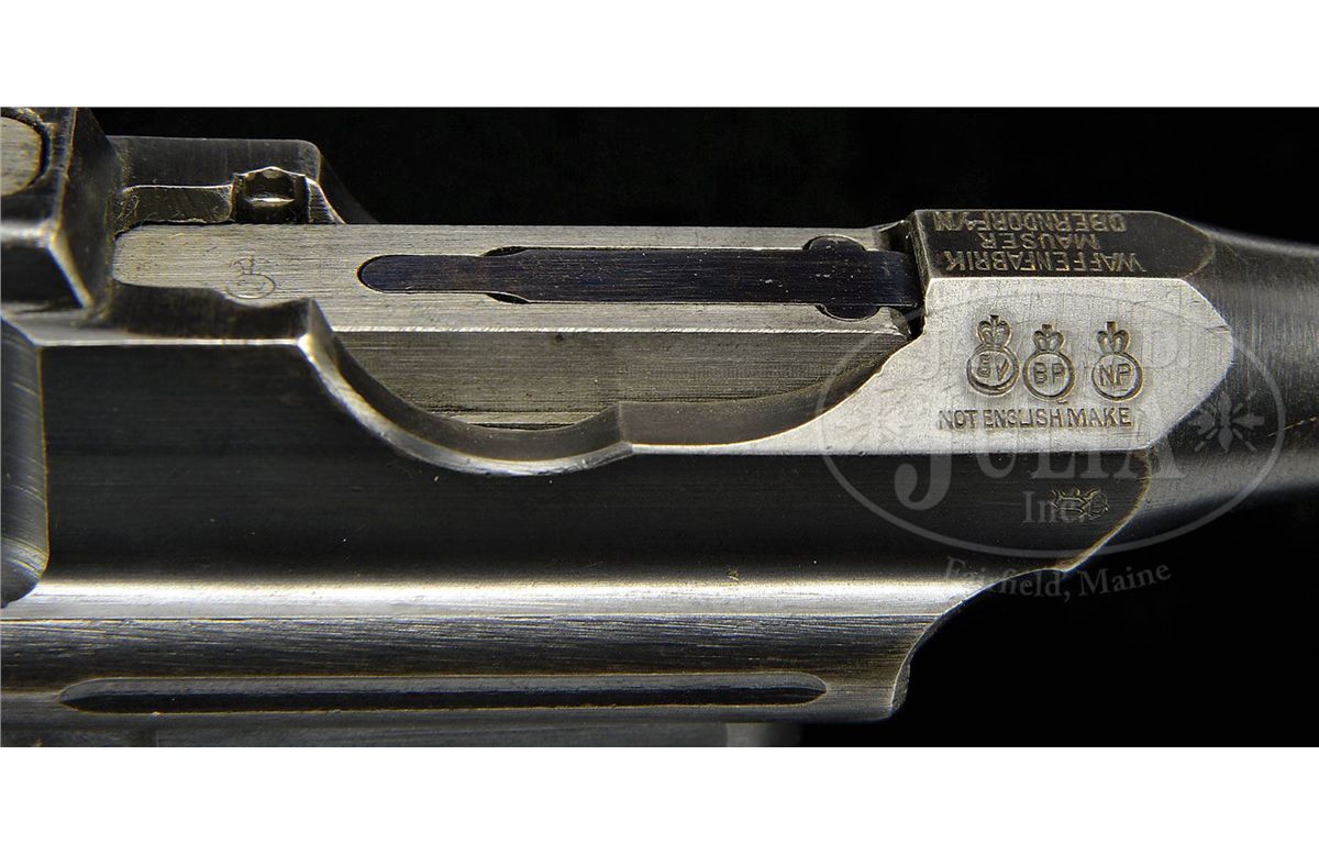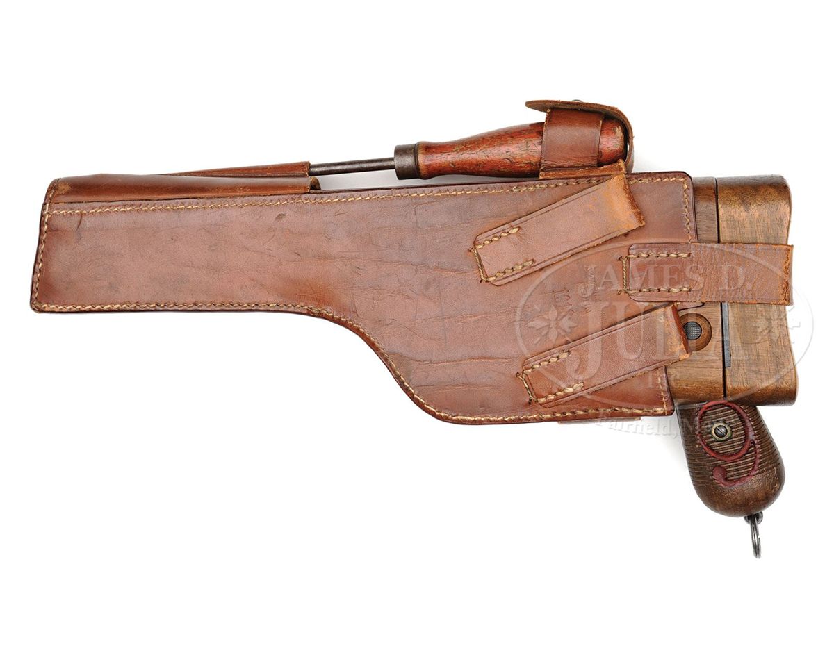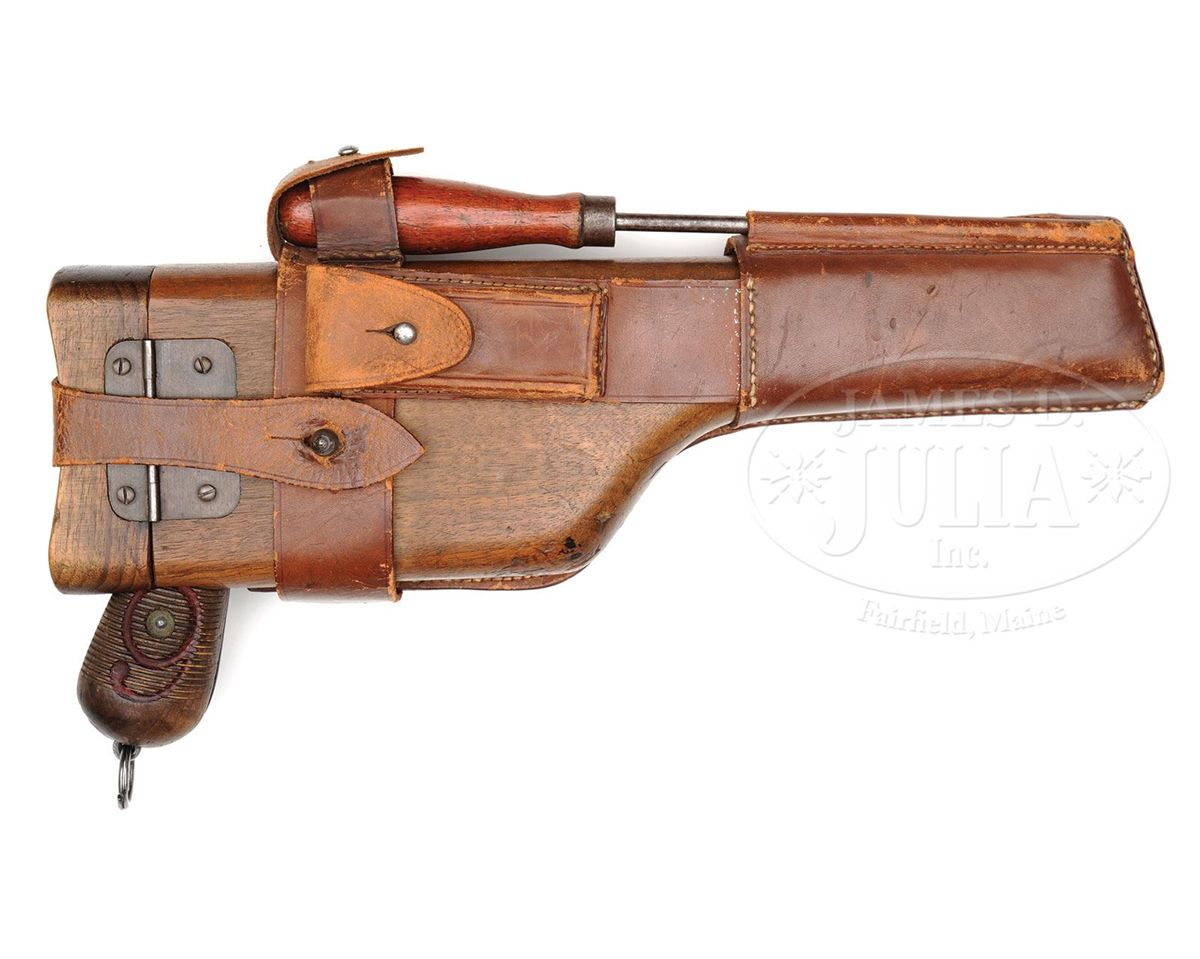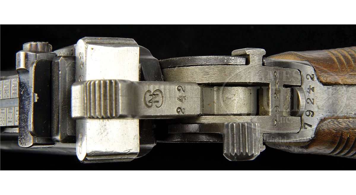 SN 79242. Caliber 9mm. Standard Red 9 with 5.5’’ bbl with 50-500 slip-in rear sight. Standard chamber address and full serial number on the left chamber flat. Small Crown-U on left side on bbl extension; Imperial military acceptance on the right side. This gun has a short fire blued extractor along with a fire blued cursor, bolt stop, firing pin, safety, trigger and grip screw. Two line address on right side of frame. Standard walnut grips each marked with a large red 9. All visible numbers are matching. Accompanied by the matching full length shoulder stock, leather carrier and cleaning rod. PROVENANCE: Collection of Dr. Geoffrey Sturgess. CONDITION: 95% original rust blue with comparable condition fired blue small parts. Dark grips with minor handling marks. Original paint in the red 9. Bright bore and perfect mechanics. Original matching lug with prominent machine marks and toning, comparable condition hinge. Very good, original leather carrier with cleaning rod whose handle has been stained to a russet color. An extremely fine example of an all matching Red 9 rig. 4-52124