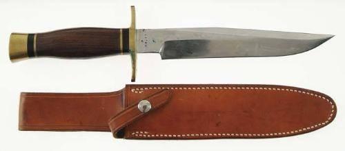 FINE MORSETH HUNTING KNIFE. Typical Morseth pattern with 6" Bowie style blade marked on left side "19MORSETH91". It has a German silver hand guard with stag & ebony handle. Accompanied by its orig tube sheath. CONDITION: Extremely fine. A spot or two of light pitting. Sheath is fine. 4-55627-1 JR12
