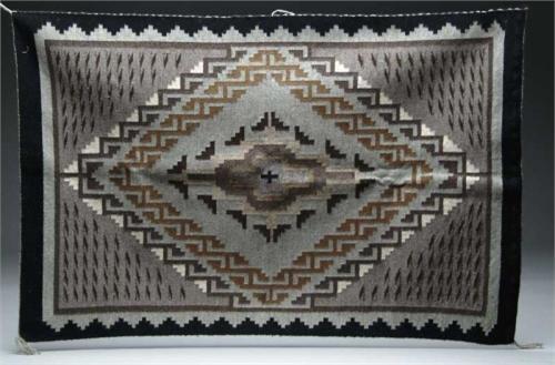 FINE NAVAJO RUG. Two gray hills pattern circa mid-20th Century. Fine weaving with central geometric medallion having colors of black, gray, gold, brown and white. SIZE: 38” x 25”. CONDITION: Very good. 9-26682
