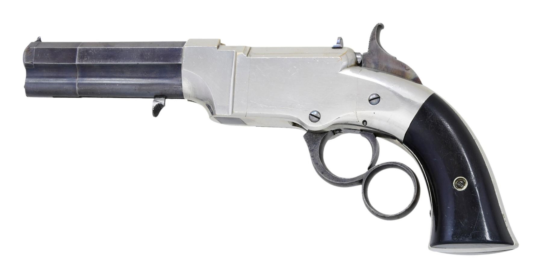 PISTOL CONVERTED TO RIMFIRE. Cal 32. S# 1284. Originally manufactured between 1858-1860 by the New Haven Arms Company for the self-contained "rocket ball" cartridges, upgraded around time of Civil War with Henry style rimfire firing pin. Standard configuration otherwise with 3.5" octagonal barrel, integral magazine, "NEW HAVEN CONN PATENT FEB 14 1854" stamped on top flat in one line, fixed notch rear sight, pinched post front sight, silver plated brass frame, varnished rosewood grips. CONDITION: fine overall, barrel and magazine retain most of their original blue finish, frame retains most of its bright silver plate, well-fit grips retain virtually all their original varnished finish. Mechanics need attention, hammer will not hold on full cock, magazine missing its spring. Sharp frosted rifled bore. (01-26627/JS). ANTIQUE. $5,000-7,000.