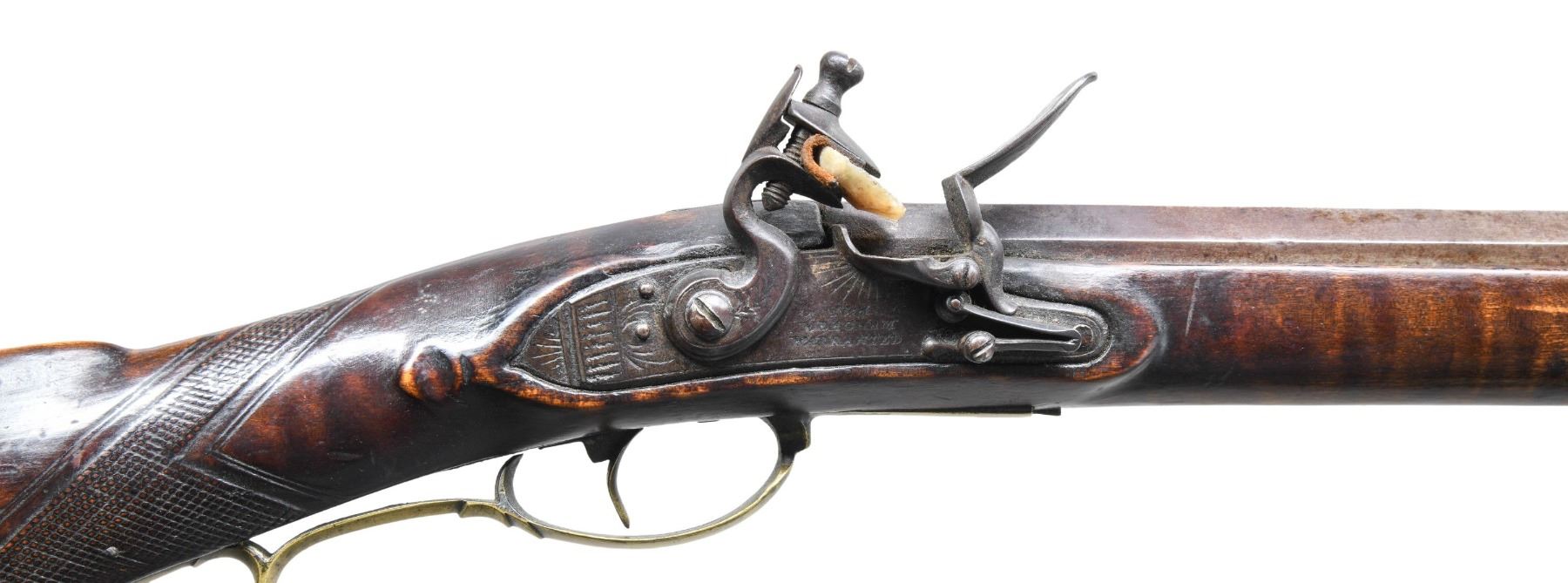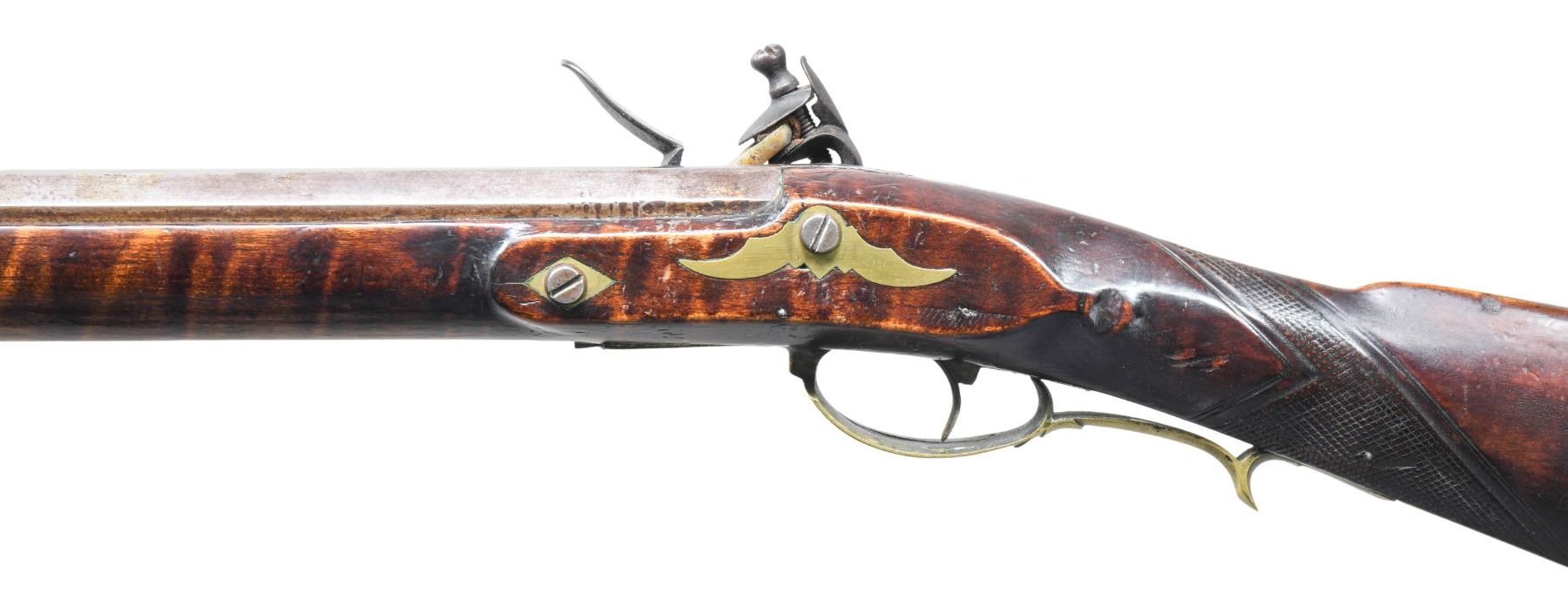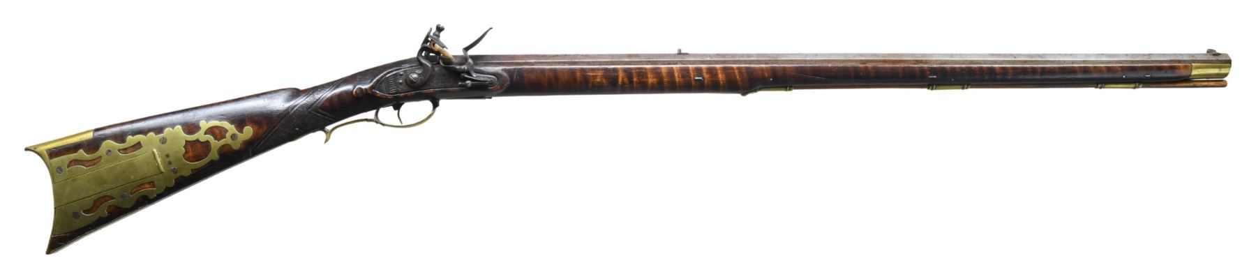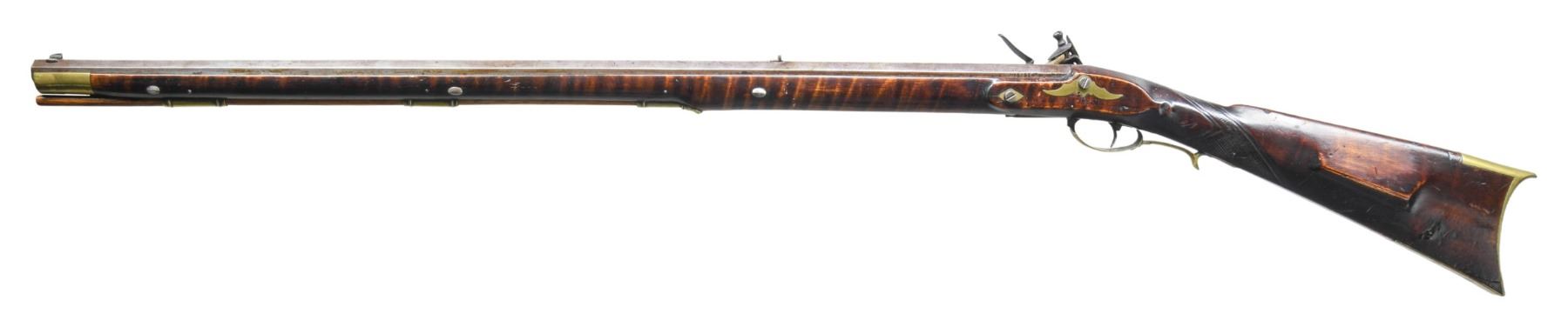RIFLE", CIRCA 1820. Cal. 36. NSN. 47" overall, 31.25" octagonal barrel, engraved lock marked "J&H MEACHAM / WARRANTED", brass furniture, figural pierced patchbox, tiger striped maple stock, checkered wrist. UNATTACHED ACCESSORIES: old string tag "the ball cast in the Allen Pistol mould will fit the boys cute Kentucky using the bed tick patch". CONDITION: very good to fine overall, complete & original, stock has hand worn patina, mechanics fine, crisp bright rifled bore. PROVENANCE: from a prominent collector. (01-28024/JS). ANTIQUE. $2,000-3,000.