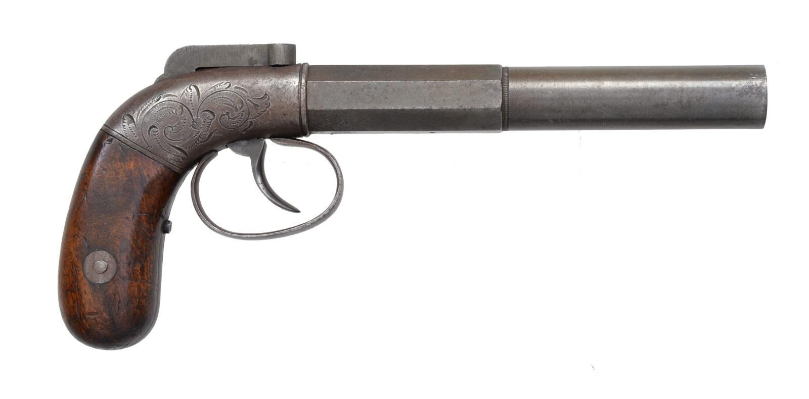 SHOT PISTOL W/ COMBINATION TOOL. Cal. 34. S# 6. Bbl. 5" oct. to round smoothbore bbl., marked on top 3 flats “PATENTED”, “1837”, & “CAST STEEL”, bar hammer unmarked, engraved frame, lightly figured walnut grips. CONDITION: fine overall, complete & matching thin traces of blue on bbl., overall smooth gray, muted case colors on hammer, mechanically fine w/ clear smooth bore. The accompanying two cavity mold/combination bbl. wrench is good to very good overall w/ iron patina. PROVENANCE: Lifelong collection of early Allen pistols. (01-18610/JS). ANTIQUE. $400-600.