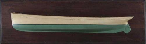 FINE PAINTED HALF HULL MODEL. The well carved ship’s hull painted in white and green is mounted on a walnut molded edge backboard. Appears to be first half of the 20th Century. SIZE: Model is 42-1/2” l x 5-1/2” t. Total size is 50-1/2” x 15-1/2”. CONDITION: Generally very good condition with only minor nicks to paint. 9-27521