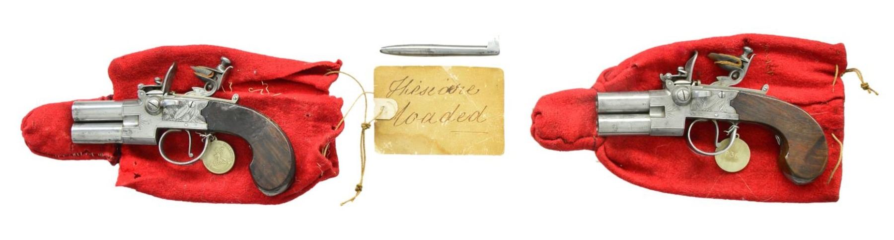 FLINTLOCK POCKET PISTOLS. Cal. 36. NSN. 6” Overall, 1.5” twist off barrels, boxlock frames marked on either side engraved with panoply of arms, “SPENCER” & “LONDON”. There is a sliding safety and alternate barrels are fired by rotating lever on left. Complete with rarely seen surviving barrel wrench. Each barrel has a matching number to the breech. This beautiful pair of pistols are found in their original red baize bags with a wonderful ancient tag “THESE ARE LOADED” on back of a New Bond St. wine merchant’s card. I guess they were having liquor store holdups 200 years ago. CONDITION: good to very good overall, smooth gray steel, crisp engraving, 1 wood grip has glued crack repair, both mechanically fine with clean smooth bores. (01-21867/JS). ANTIQUE. $2,000-3,000.
