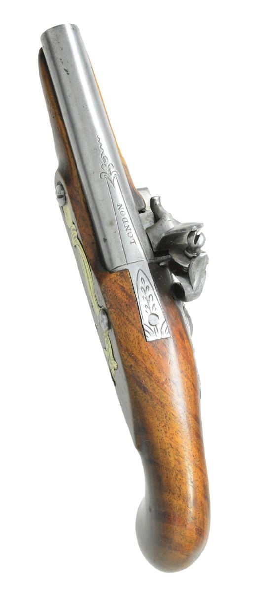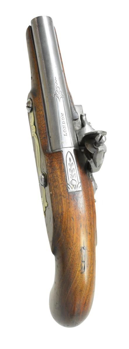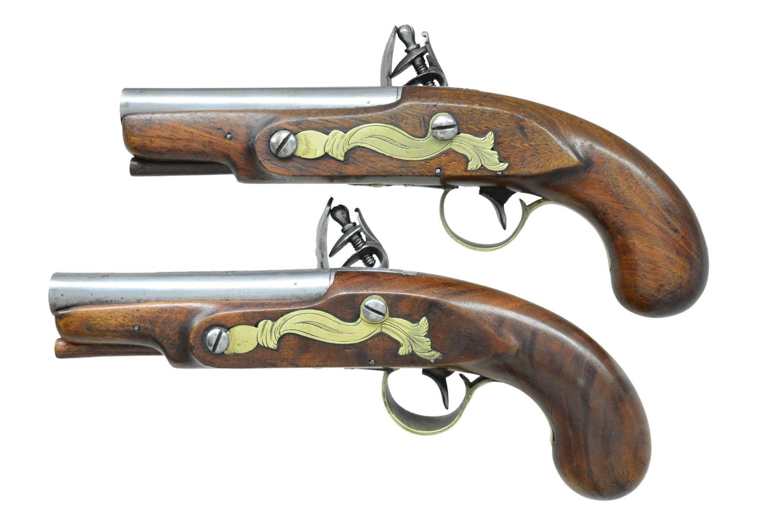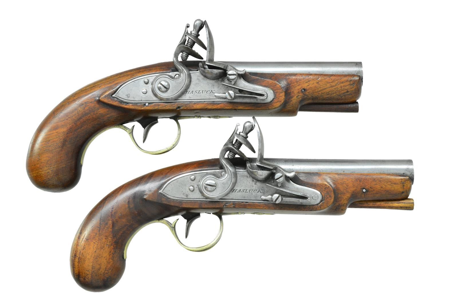 BOTH: Cal. 45. NSN. 8 1/2" Overall. Bbls. 4" rnd. marked “LONDON”, locks marked “HASLUCK”, unsupported serpentine cocks, engraved brass trigger guards & sideplates. CONDITION: fine overall, well fit, original & complete, iron cleaned w/ gray/bright patina, brass w/ light mustard patina, wood has sharp edges w/ hand worn patina. 1 gun has fine mechanics, the other has weak mainspring which needs attention, smooth clear bores. PROVENANCE: From the Collection of John "Tim" Breth Jr. (01-17787(2)/JS). ANTIQUE. $1,500-2,000.