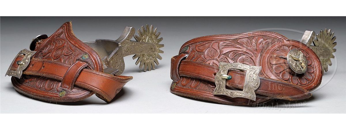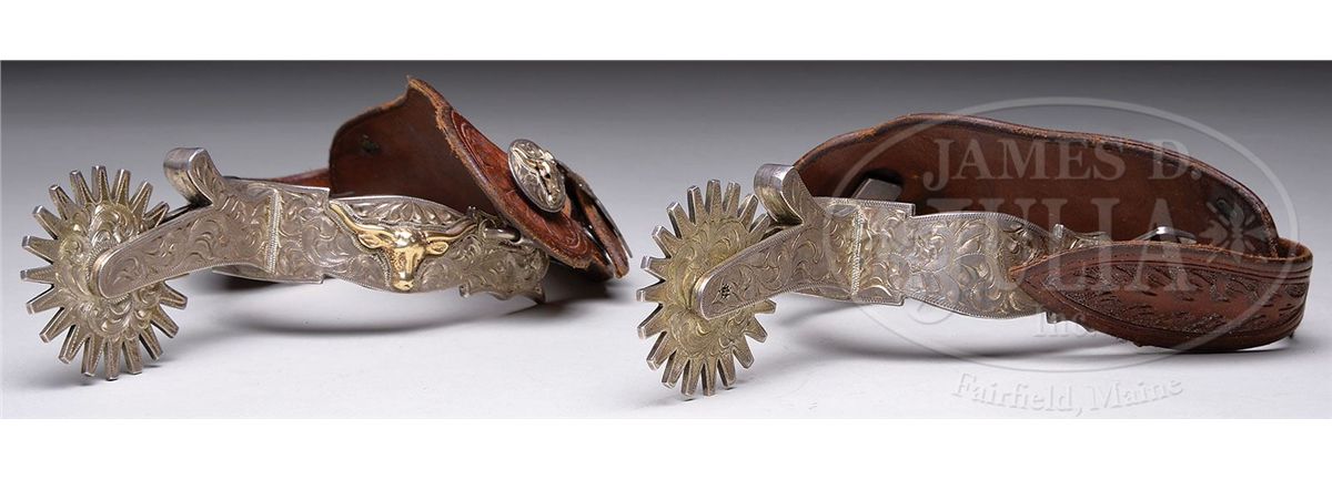 Beautiful spurs with heavy sterling yoke & shank. Yoke has swinging buttons and the shank chap guards with 2-1/8" rowels that have 20 flat tip points. Yokes & shanks along with the rowels have full coverage foliate arabesque pattern engraving with zigzag borders and large raised gold longhorn steer heads on the outside of the yokes. Outside buttons also have a small raise gold steer head. Mounted with very nicely tooled, lined straps with silver buckles. Consignor states that he has owned these spurs at least 15 years. He stated he spoke with Mr. Wesley who stated that this is the only pair he ever made in this configuration and he would never make another pair. CONDITION: Very fine, have been worn but appear new. Straps are soft & supple with a fine russet brown color. 4-47781 JR86