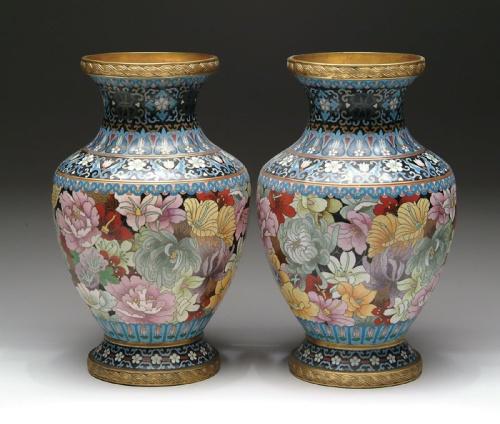 FINE PAIR OF ORIENTAL CLOISONN JARS. The shaped vase with brass colored top and bottom rims. The central band of colorful chrysanthemums and flowers. SIZE: 12in. h x 7in. at widest. CONDITION: Very good. 9-26566