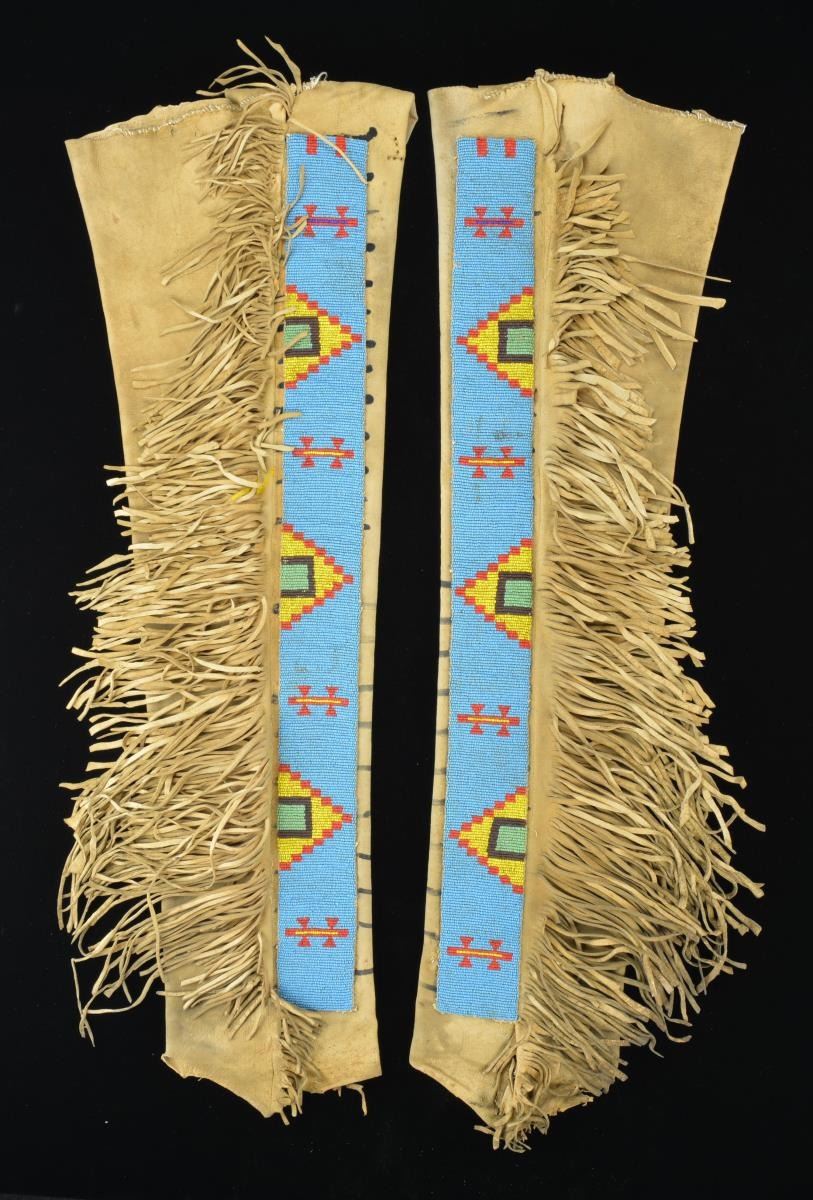 About 35” leg length with 29 x 2.75” beaded panels, red, yellow, reds, green, and burgundy on light blue ground. CONDITION: Good to very good overall, supple, soiling. (02-17015-20/JS). $600-800.
