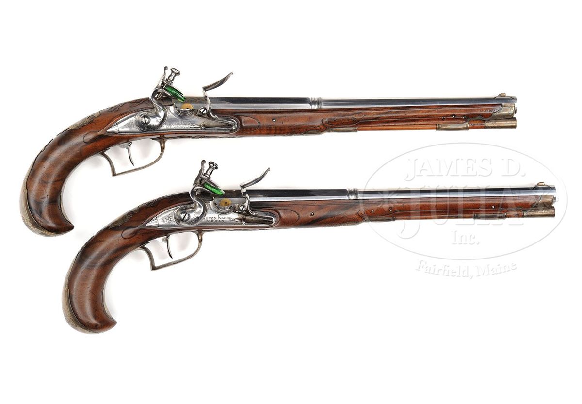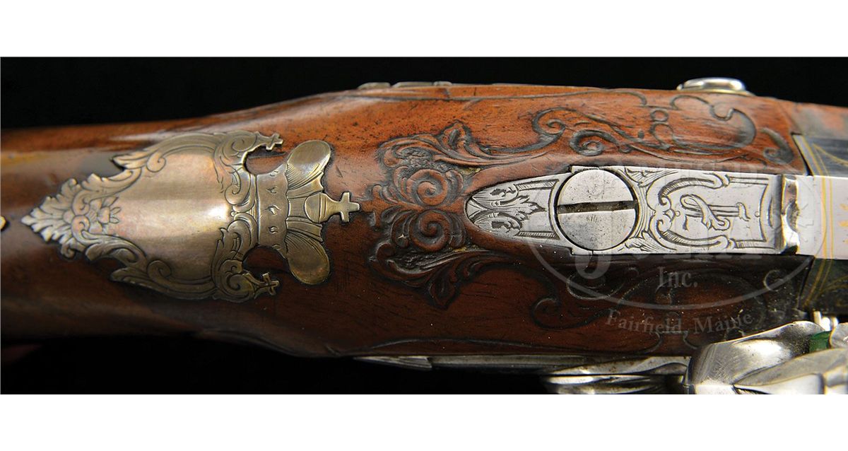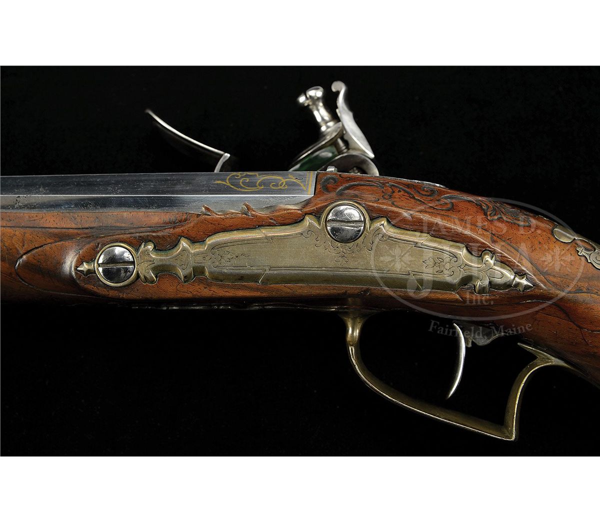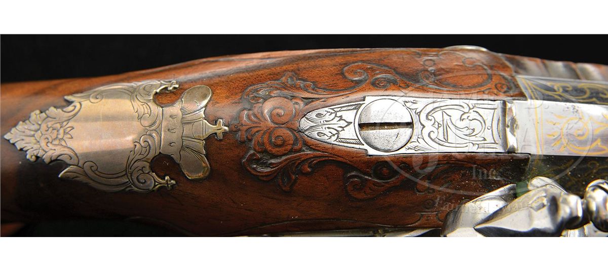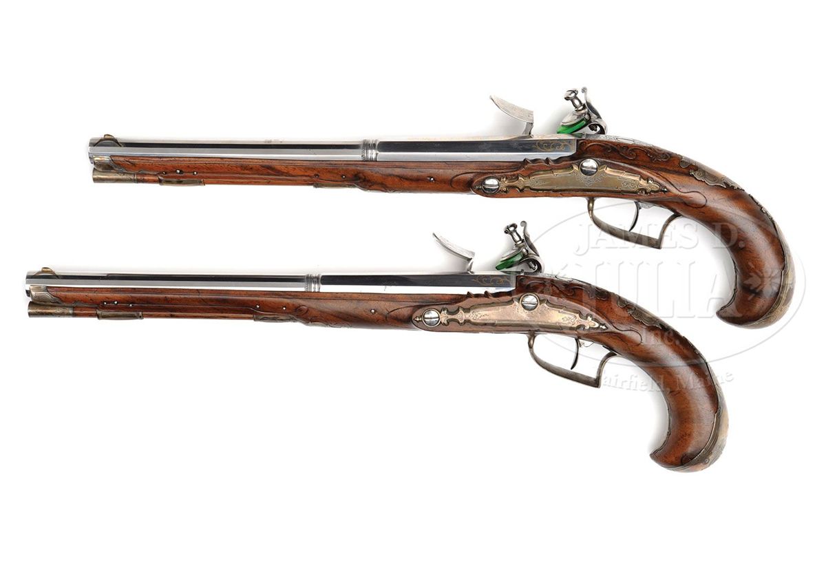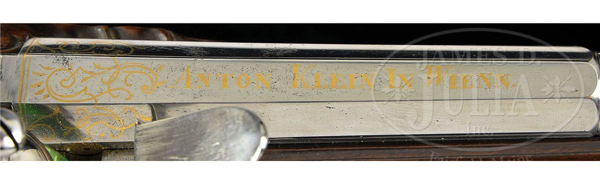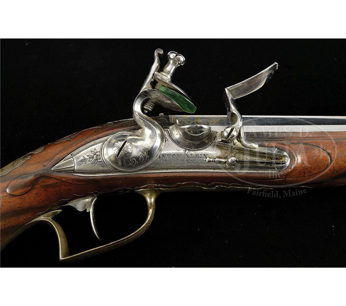NSN. Cal. .482 at muzzles. 11-1/2" Octagonal to 16-sided with wedding band transition bbls, are gold inlaid "Anton Klein in Wienn." (1753 - 1782) on top flats, and also have inlaid gold filigree at breech ends. Touch holes are gold lined. Silver front sights are inlaid into front portions of bbls in four pointed stars. Bbl tangs with integral sights are numbered "1" and "2". Locks with inset rounded pans have unbridled friction frizzens, and are mounted with round bodied serpentine cocks. Lockplates are rounded and have deep cove molded chamfers. There are some flourishes of scroll engraving and "Anton Klein" "In Wienn" is under each pan. Nicely marbled, dense, European walnut stocks have cove moldings along ramrod channels, and raised moldings around trigger guard finials, which terminate in relief carved scroll. There is more relief carving around bbl tangs. Stocks extend to muzzles and terminate in silver caps, and are pinned to bbls. All furniture is of silver, including fancy square backed trigger guards, large rear plates on birds head grips, crest plates, and terminate in crown motifs. Heavy sideplates are deeply chamfered and have light scroll engraving. Hickory ramrods with silver tips mount through octagonal pipes with beaded ends. Tailpipes have finials matching trigger guards. PROVENANCE: Collection of Dr. Douglas Sirkin. CONDITION: Fine. All steel parts are polished to bright silver over some light pitting, engraving slightly softened, but flats of bbls and sharp edges are perfectly preserved. Stocks are very fine with hand worn patina. Carving is slightly rounded. Silver is toned, engraving slightly rubbed. A beautiful pair of very high quality pistols. 4-49907 MGM327