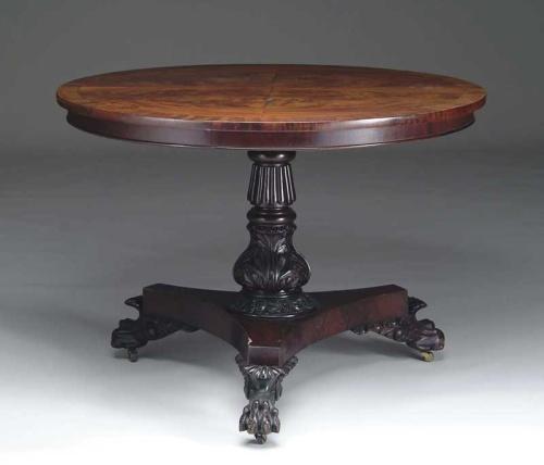 FINE PHILADELPHIA CARVED TIP TOP CENTER TABLE. The top with nice veneers supported by a well carved leaf and flute decorated column on a triangular base with winged carved claw feet with original brass casters. CONDITION: Very good. 9-27040