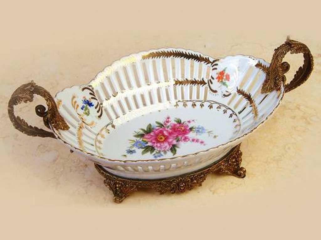 FINE PORCELAIN FRUIT BOWL / CANDY DISH - WHITE GLAZED FINISH - FLORAL DESIGN BRUSHED WITH GOLD - INTRICATE CUTWORK ALL AROUND - BRASS HANDLES & BASE - 12L" X 8W" X 6H"