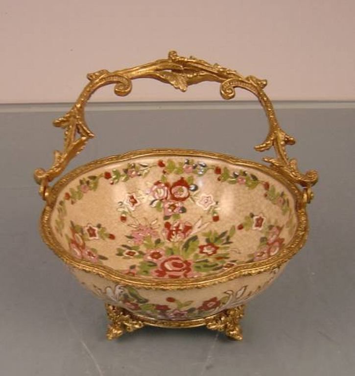FINE PORCELAIN HANDLED BOWL - HAND PAINTED RED & GREEN FLORAL BOUQUETS - ORNATE BRASS HANDLE, TRIM AND BASE - ANTIQUE CRACKLED FINISH - 7L" x 6.5W x 8H"