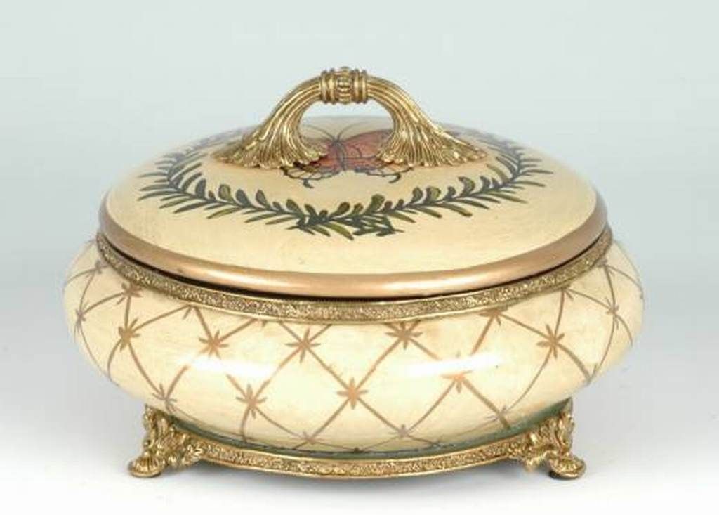FINE PORCELAIN LIDDED BOWL - GOLD PAINTED DIAMOND SHAPED DESIGN - LEAF DESIGN ON LID - BRASS HANDLE, TRIM AND BASE - 7L" X 7W" X 4.4H"