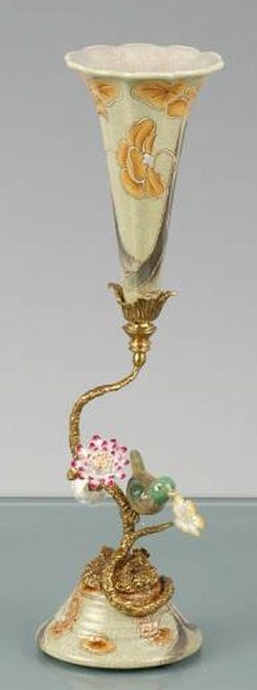 FINE PORCELAIN VASE ON STAND - CRACKLED FINISH - HAND PAINTED DESIGN OF BIRDS AND FLOWERS - BRASS STEM - 5.1L" x 5.1W" x 16.5H"
