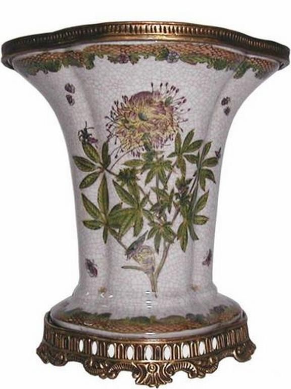 FINE PORCELAIN VASE - CRACKLED FINISH - HAND PAINTED FLOWER AND BUTTERFLY DESIGN - BRASS ACCENTS - 9L" x 10"H