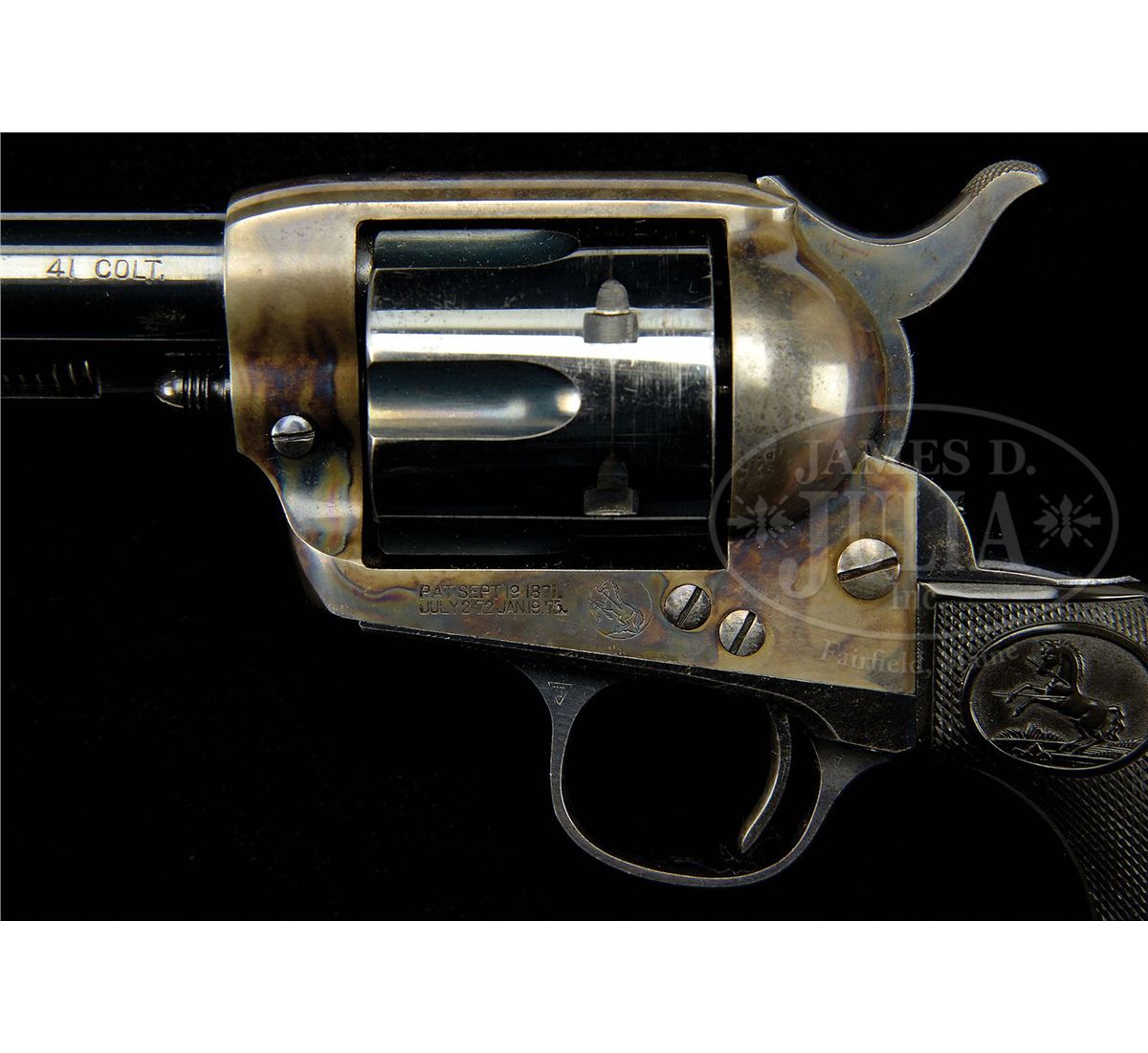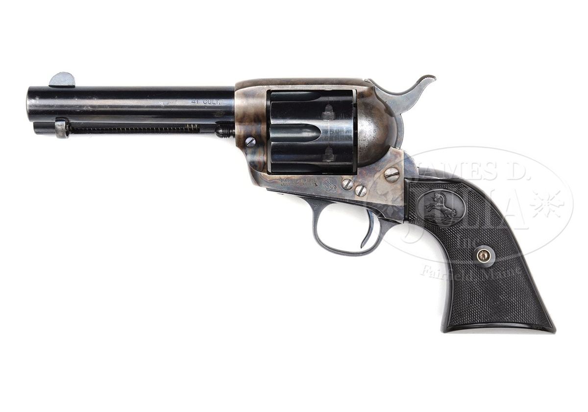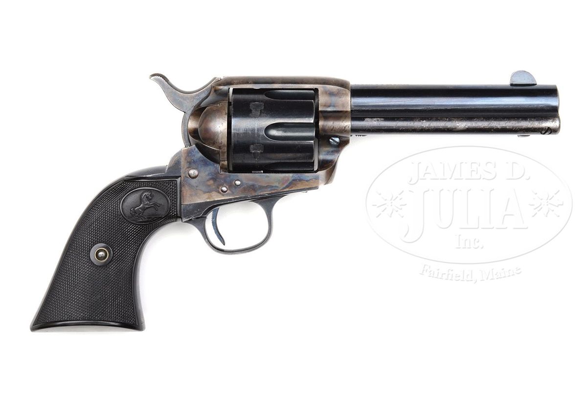 SN 317988. Cal. 41 Colt. Blue & color case hardened with 4-3/4" bbl, slightly altered front sight and 2-line address with caliber marking on left side. Left side of frame has 2-line, 3-patent dates and rampant Colt in a circle. Mounted with rampant Colt hard rubber grips with last four digits of matching SN scratched inside each grip. This revolver was produced in 1911 when the West was still active and law enforcement personnel and bad guys were still carrying Single Action Colts. The 41 caliber revolver was favored by a number of people for its reasonable velocity & energy and mild recoil. CONDITION: Very fine, all matching except cyl which is unnumbered. Bbl retains 93-95% glossy orig blue with light holster wear around the muzzle and a few spots of wear on left side; ejector housing retains strong orig blue in the gullets showing holster wear and some flaking on outer radius; frame & hammer retain virtually all of their orig case colors, brilliant in sheltered areas, lightly to moderately faded elsewhere, thin on recoil shield; cyl retains 92-93% glossy orig blue with one small area of fine pinprick pitting from long term storage in a holster; grip frame retains about all of its orig factory blue, a little thin near the heel of the backstrap. Grips are sound showing very light diamond point wear. Mechanics are crisp, brilliant shiny bore, has been fired but very little. 4-48807 JR357