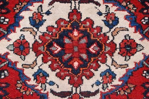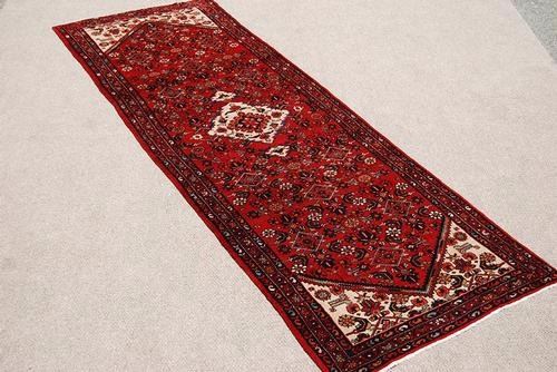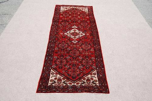 FINE QUALITY HAND WOVEN PERSIAN HAMEDAN RUNNER. SIZE 3.9 X 11.7 FEET, MADE OF FINE QUALITY LAMB'S WOOL PILE ON COTTON FOUNDATION, ALL NATURAL VEGETABLE DYE, INCORPORATING A LOVELY GEOMETRIC DESIGN ON A RICH RED BACKGROUND, CENTER ROW OF LARGE MEDALLIONS, AND AN INTRICATELY DONE GEOMETRIC BORDER. HAND WOVEN IN HAMEDAN, Iran.