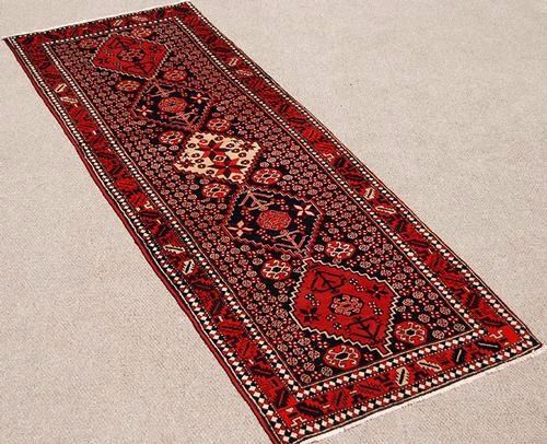 FINE QUALITY HANDMADE SEMI AUNTIQE PERSIAN HAMADAN. SIZE SIZE 3.7 X 10.1 FEET, MADE OF FINE QUALITY BABY LAMB'S WOOL PILE ON COTTON FOUNDATION, ALL NATURAL VEGETABLE DYE, A BEAUTIFUL REPEATED FLORAL MOTIF ON A BLACK AND RED BACKGROUND. WITH A ROW OF FIVE LARGE MEDALLIONS AND INTRICATELY DONE GEOMETRIC BORDER. HAND WOVEN IN HAMADAN, Iran.