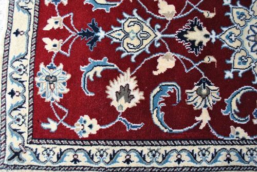 100% BABY LAMB'S WOOL PART SILK ON COTTON FOUNDATION. HAND MADE VEGETABLE DYE RUG FROM CITY OF NAIN. SIZE 4.6X2.6 FEET. COUNTRY OF ORIGIN: Iran