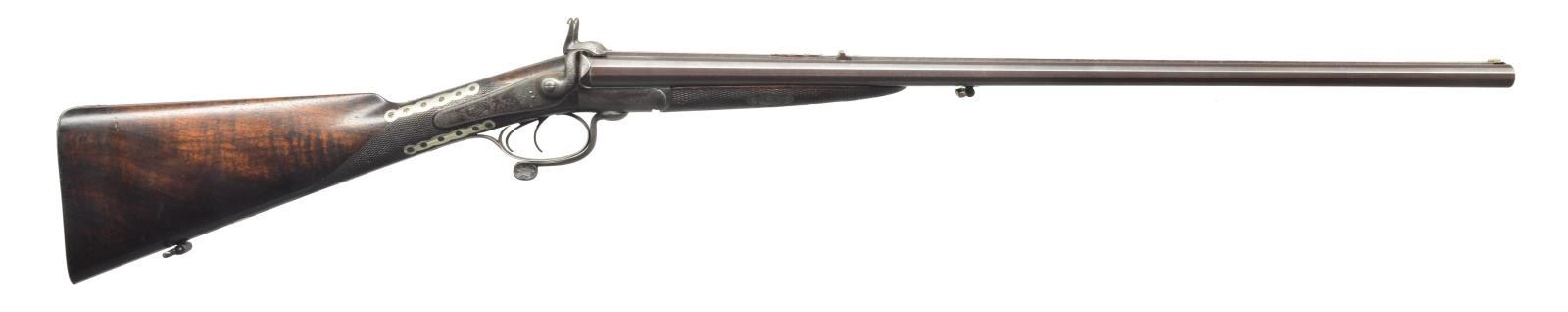 Cal. .577, 2 1/4" Pinfire (for very early rimless case). (585 groove diameter). S# 645. Finely made 16-sided Damascus bbls. are engraved "B. Denyer 131 Holborn Hill. London" (working at this address 1851-1875) on full length slightly raised rib. Lg. single standing leaf U-notch rear sight is dovetailed through in front of 4 delicate folding leaves marked for 80, 100, 150, & 200 yds. A silver bead front sight is also dovetailed through. London black powder proofs are on bbl. flats. A sling loop is soldered to bottom rib. Rnd. bodied early Lefaucheux type lever over guard action is fitted w/ back spring peninsula locks w/ rnd. bodied serpentine hammers having nicely filed dolphin shaped heads. Action & locks are engraved w/ 60% coverage of very nicely cut shaded scroll w/in scroll borders. Maker's name & "London" is on each lockplate behind game scenes w/ running stag on left & standing stag on right. A recumbent stag is on trigger guard bow & S# is on tang. Well figured & lightly streaked European walnut straight grip buttstock measures 14 1/8" over steel buttplate w/ 1" top spur. Flat top point pattern checkering is at grip & a vacant silver oval along w/ sling loop is on toeline. Matching fully checkered splinter forend w/ inlet steel tip attaches to bbls. w/ captive side bolt through shaped & engraved steel escutcheons. CONDITION: good w/ repairs, bbls. retaining a considerable amount of what appears to be original brown finish w/ fair definition to pattern, but bbls. have darkened overall. Action & locks retain traces of color, but are mostly gray brown. Stocks retain most of what appears to be an old oil refinish done at time of interesting repair at grip consisting of 4 crenelated 3" x 1/2" German silver strips neatly inletted & screwed into wrist. Bores are fair to good w/ strong rifling, somewhat pitted throughout. Action is tight. Locks are good. An interesting early rifle. (01-18405/MGM94). ANTIQUE. $800-1,200.