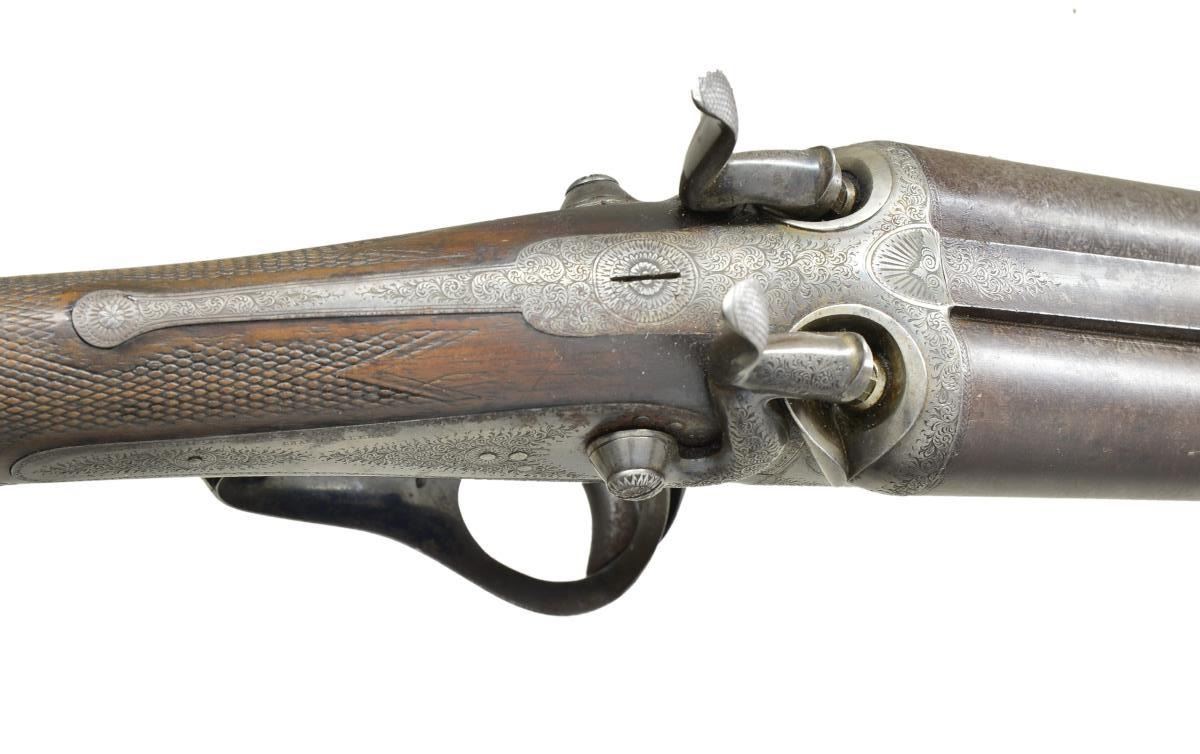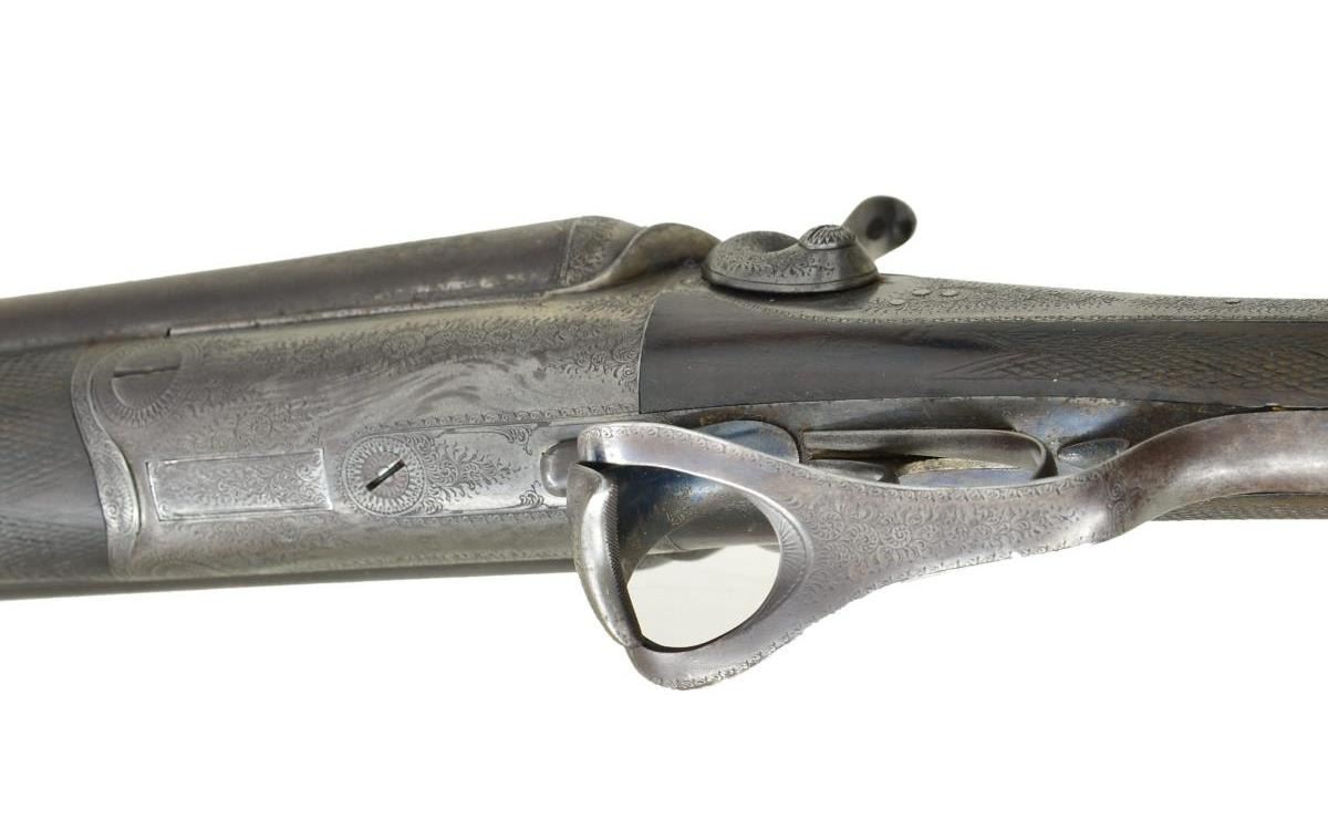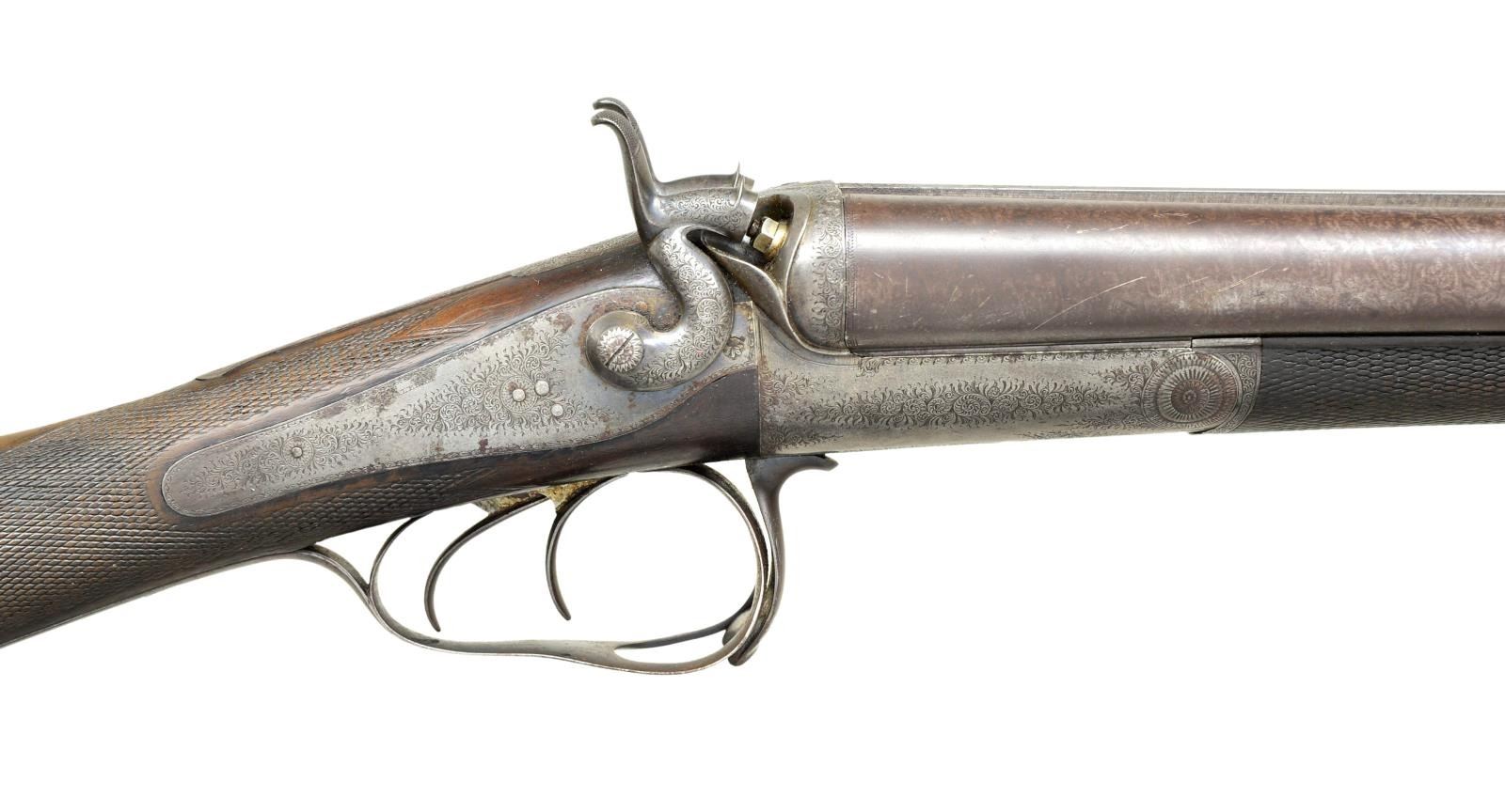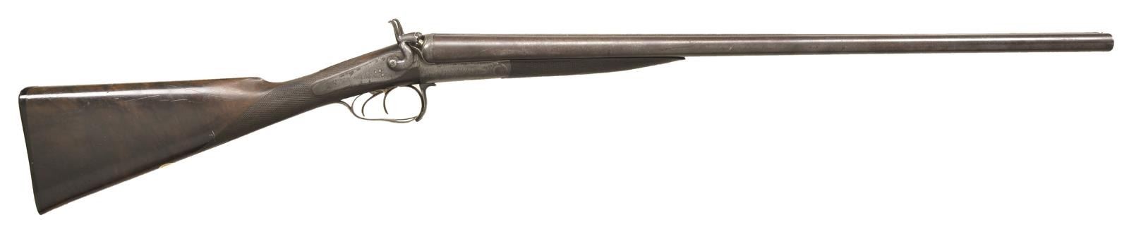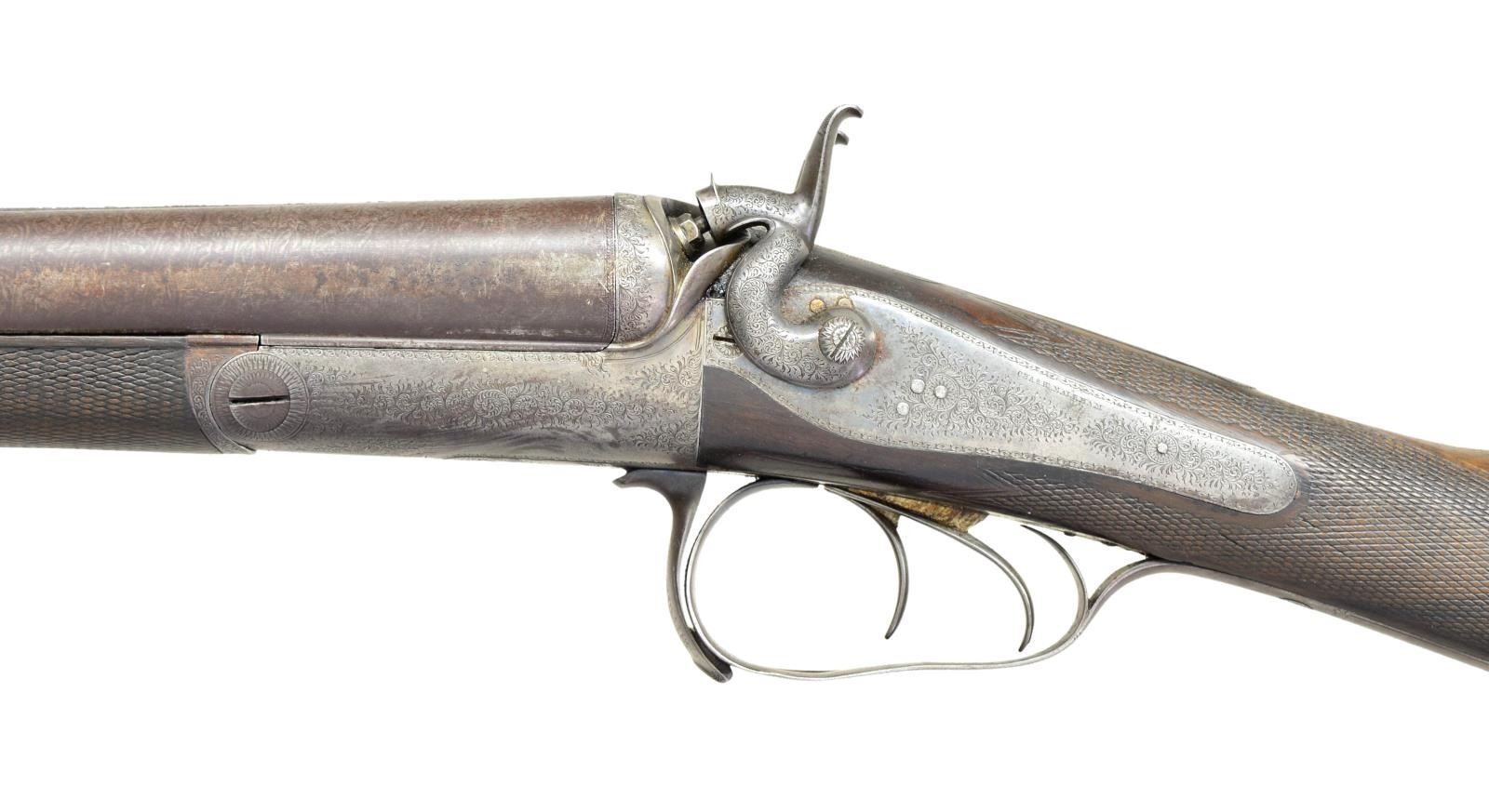 CHARLES MALEHAM. Cal. 12 Ga., 2 5/8". S# 1267. This fine gun built to Purdey's patent has 28" Damascus bbls. engraved "Chas H. Maleham 5 Westbar Sheffield. No 1267." on medium width game rib. Bbl. flats are stamped with London black powder proofs. Case hardened round bar Purdey third type thumbhole action is fitted with penninsula backspring locks with serpentine rebounding hammers. Water table is stamped "JP Patent No 1104" with use number "4242". It is also stamped "Patent Bolt". Action and lockplates are engraved with 80% coverage very well cut small scroll. Maker's name is at the top of each lockplate. Thumbhole trigger guard with scroll on bow has serial number on tang. Straight grip buttstock of well marbled and nicely stump figured European walnut measures 14 5/8" over original checkered horn buttplate. Flat top point pattern checkering is at grip and a gold oval engraved with the monogram "CDO"? is on toeline. Matching splinter forend with shaped steel tip has pushbutton Deeley type release. Button is stamped with W. C. Scott lighthouse logo over "PATENT". MEASUREMENTS: BBLS: Bore Diameter: R .734", L .735". Recess Choke: R .021" (MOD), L .021" (MOD). This treatment appears to be original and was an early method of concentrating shot pattern and is quite effective. Min. Wall Thickness: R .018" bottom of recess .027" elsewhere, L .018" top of recess, .025" elsewhere. STOCK: DAH: 2" DAC: 1 11/16". LOP: 14 5/8". CAST: approx. 1/4" off. WEIGHT: 6 lb. 14 oz. CONDITION: very good to fine original as found with bbls. retaining most of their brown with good definition to pattern. Finish is thinning on sides and there is some scattered light mottling. Action and locks retain 10-25% case hardening color; balance is handworn to gray/brown. There is also some brown spotting on right lockplate. Stocks retain most of their original oil finish with a large number of small and medium nicks and dings. Checkering is somewhat worn. Bores are mostly shiny with some considerable pitting toward breech ends. There are no noted repairs or dents. Action is tight. Locks are fine. (01-21618/MGM). CURIO. $2,000-3,500.