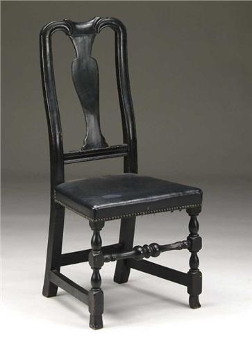 FINE QUEEN ANNE BLACK PAINTED MAPLE SIDE CHAIR. Chair having carved and molded crest, molded cyma-curved back stiles with vase formed splat , new over-upholstered leather seat, raised on block and turned frontal legs with bold turned center stretcher. Flat side and rear stretchers ending in Spanish carved feet. Mid 18th Century. SIZE: 41-1/2” h x 18” seat h x 18-1/2” across front. CONDITION: Some old repairs, generally very good. 9-26866