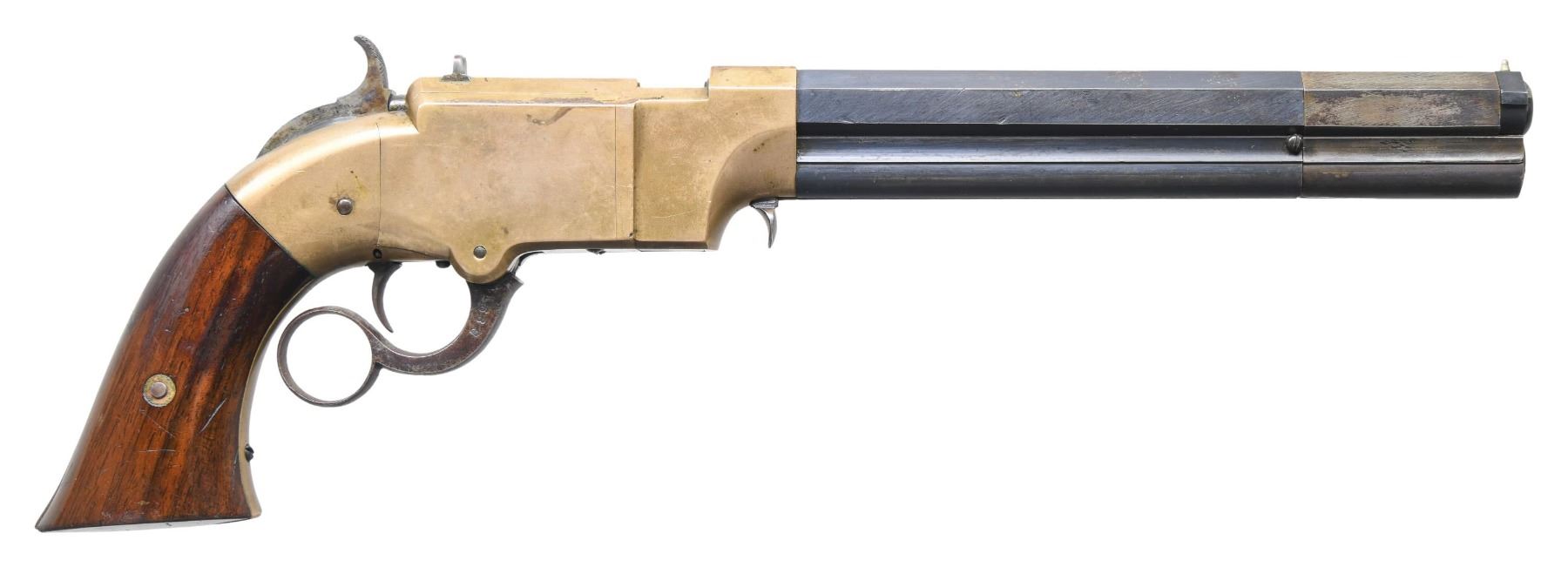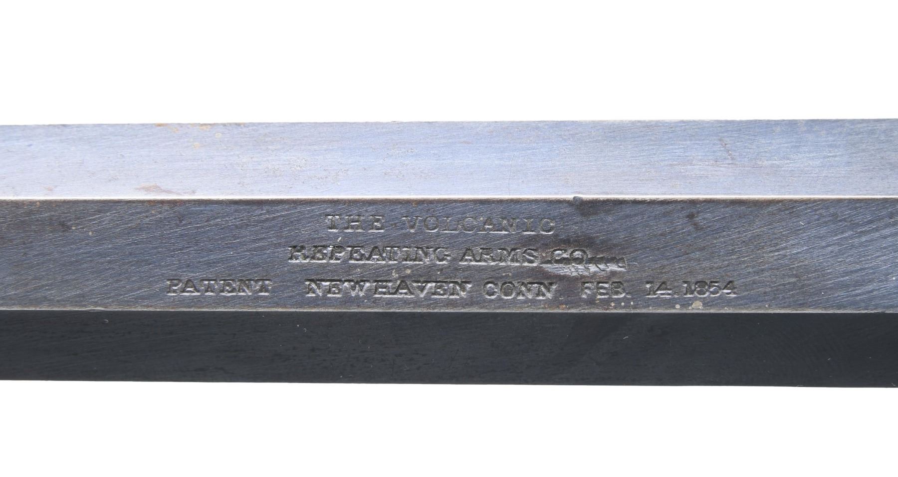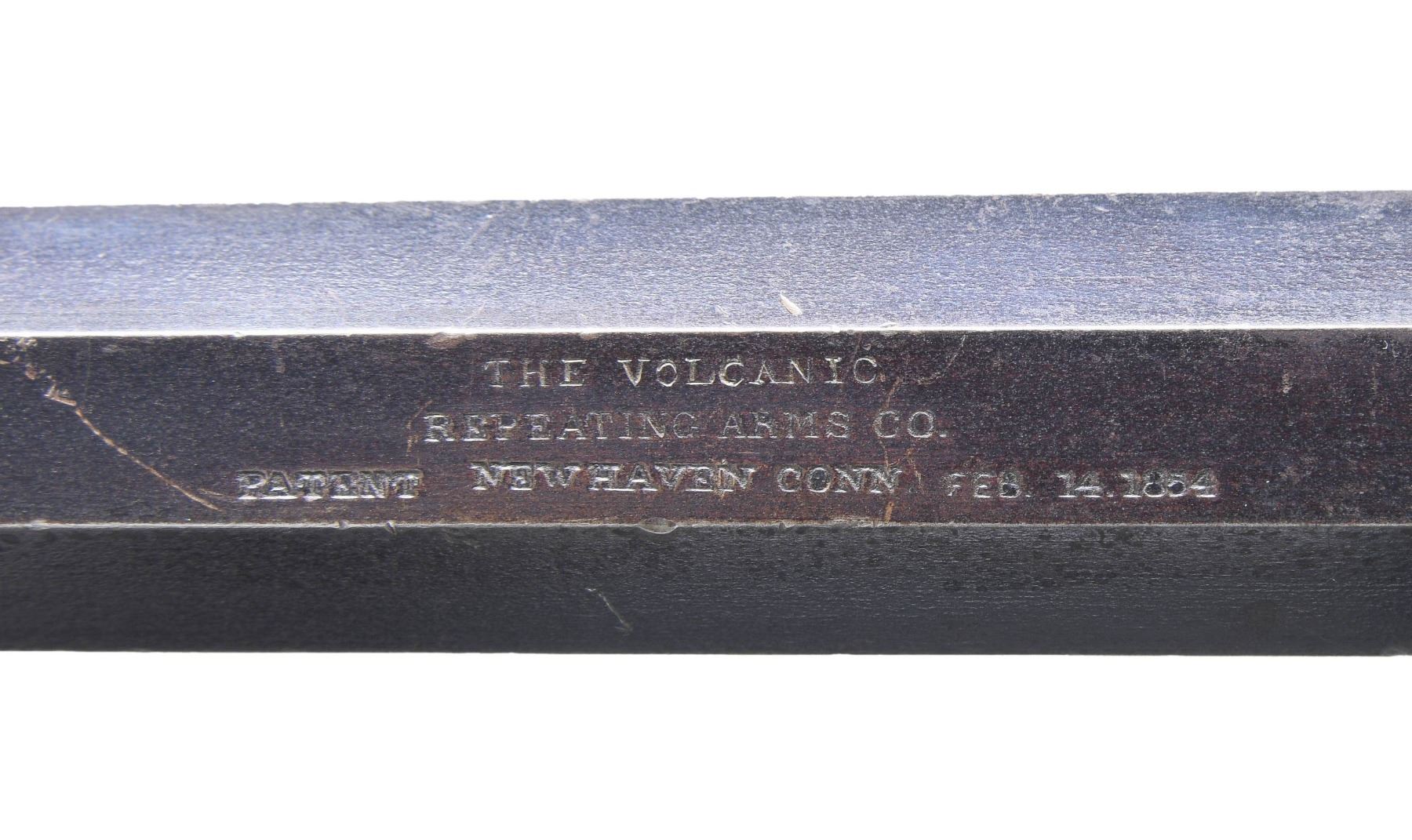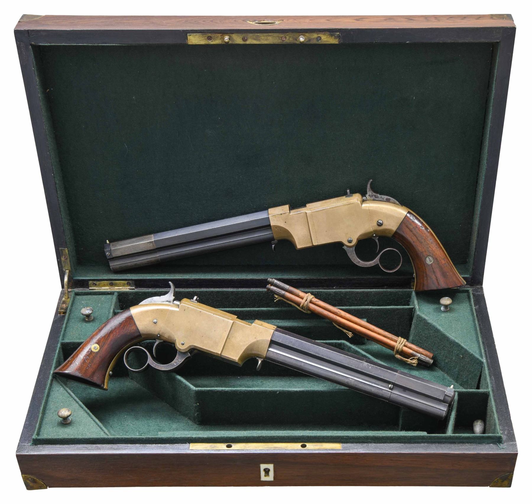 VOLCANIC REPEATING ARMS LEVER ACTION PISTOLS. Cal. 41. S# 1604/1630. Pistols are in standard configuration with blued 8" octagonal barrel, integral spring loaded magazine, fixed notch rear sights, pinched post front sights, brass frame, varnished walnut grips. Manufactured between 1855-1859 after the formation of the Volcanic Arms Company from the dissolved original Smith & Wesson Co. Barrel markings: "THE VOLCANIC ARMS CO. / NEW HAVEN CONN / PATENT FEB 14 1854" on top flat. This pair of pistols are in fine matching condition and old custom casing contains a four piece iron and wood carbine cleaning rod, and a single 41 caliber rocket ball cartridge. An estimated 1500 8" Volcanic Arms Company pistols were made 1855-1857. CONDITION: fine overall, barrels and magazines retain about 80% of their bright original blue finish, on S# 1630 the rotating sleeve at muzzle has no blue remaining but rest of barrel has virtually all its blue. Frames have smooth brass patina, well-fit grips retain most all original factory varnished finish, mechanically fine, sharp rifled bores. Accompanying casing is very good. (01-26874/JS). ANTIQUE. $8,000-15,000.