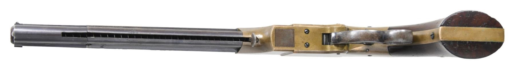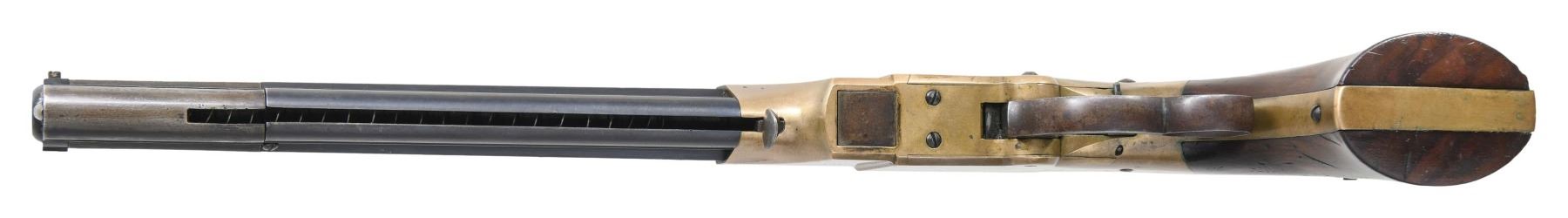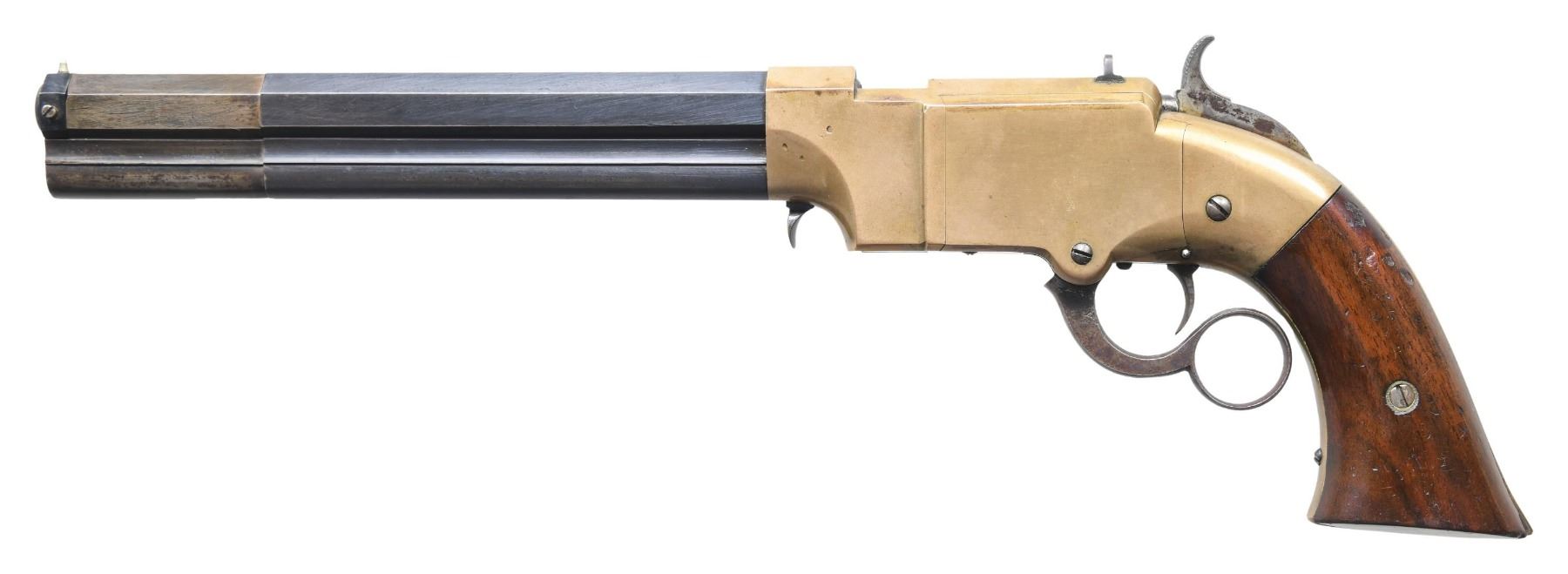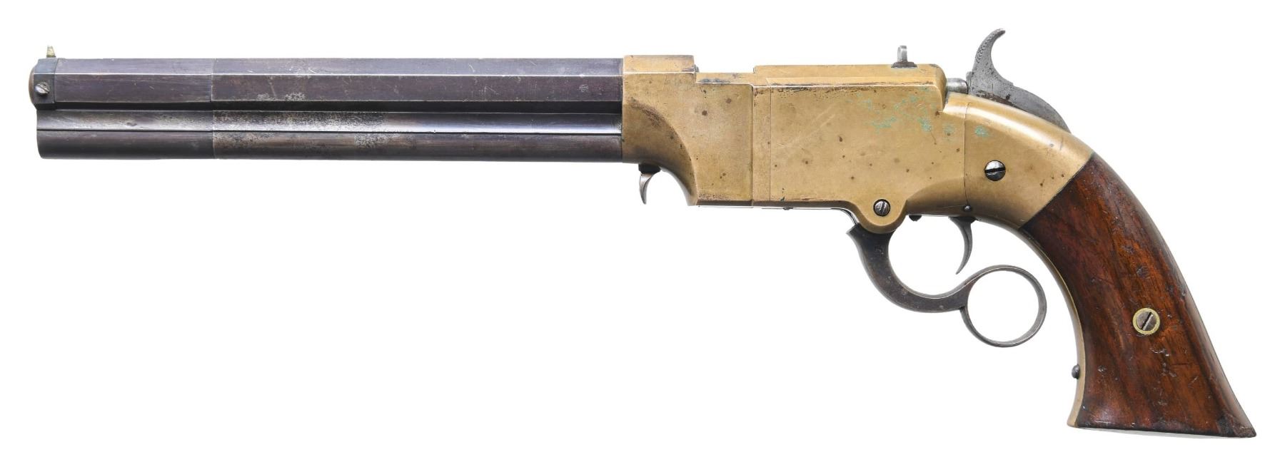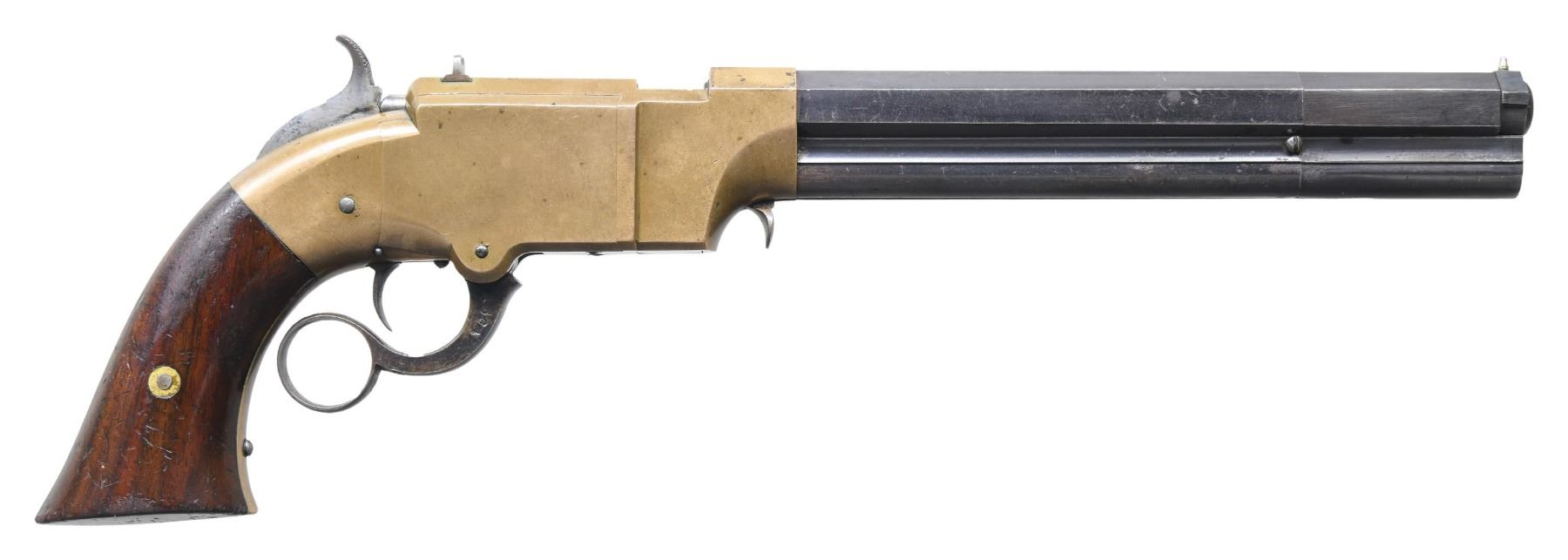 VOLCANIC REPEATING ARMS LEVER ACTION PISTOLS. Cal. 41. S# 1604/1630. Pistols are in standard configuration with blued 8" octagonal barrel, integral spring loaded magazine, fixed notch rear sights, pinched post front sights, brass frame, varnished walnut grips. Manufactured between 1855-1859 after the formation of the Volcanic Arms Company from the dissolved original Smith & Wesson Co. Barrel markings: "THE VOLCANIC ARMS CO. / NEW HAVEN CONN / PATENT FEB 14 1854" on top flat. This pair of pistols are in fine matching condition and old custom casing contains a four piece iron and wood carbine cleaning rod, and a single 41 caliber rocket ball cartridge. An estimated 1500 8" Volcanic Arms Company pistols were made 1855-1857. CONDITION: fine overall, barrels and magazines retain about 80% of their bright original blue finish, on S# 1630 the rotating sleeve at muzzle has no blue remaining but rest of barrel has virtually all its blue. Frames have smooth brass patina, well-fit grips retain most all original factory varnished finish, mechanically fine, sharp rifled bores. Accompanying casing is very good. (01-26874/JS). ANTIQUE. $8,000-15,000.