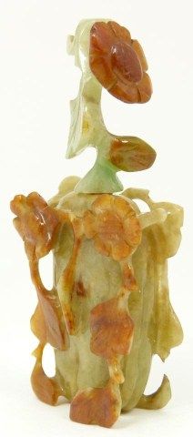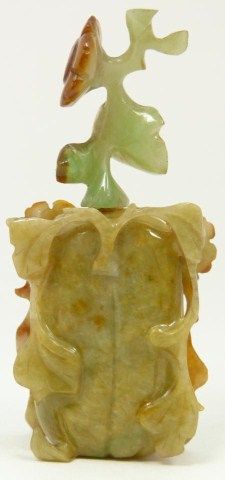 Exquisite and rare Chinese fully relief carved jadeite leaf form snuff bottle main body resembling a melon or gourd with vines, flowers and leaves climbing down both sides of the front and back with stopper being the main stem with bone spoon. The colors are excellent with the body being of a olive green with tiny russet inclusions and the front flowers, leaves and vines being of a total russet coloring and the tall stem lid having apple green, olive and russet. The surfaces are nicely polished along with fine details. Includes hardwood stand is executed with more of the same designs as the bottle with flowers, stems and leaves in an open work design with the top custom fitted to receive the bottle. 19th/20th century. Includes fitted wooden stand. Measures 3" height x 1 3/8" width + 3/4" base height (7.6cm x 3.5cm + 1.9cm). Total jadeite weight NOT including stand 41 grams.
