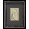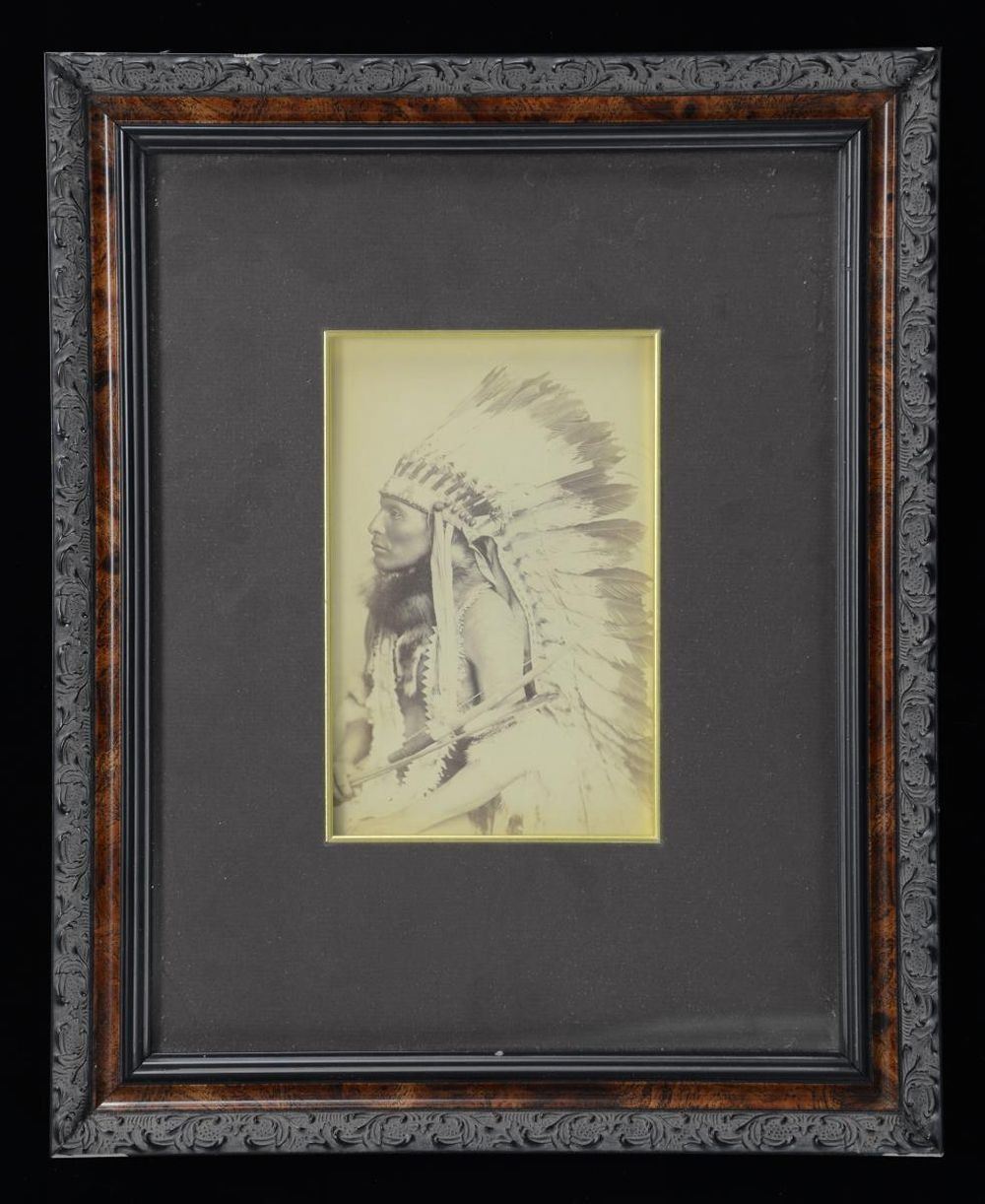 OF NATIVE AMERICAN CHIEF WITH FULL FEATHER HEADDRESS. 5" x 7.5" exposed albumen image in frame, unusual profile view, distinguished Native American chief with fur collar and full eagle feather headdress holding bow and arrows. CONDITION: appears very good, not removed from frame. PROVENANCE: from Martin Lane Historic & Western Americana Lifetime Collection. (02-21499/JS). $600-800.