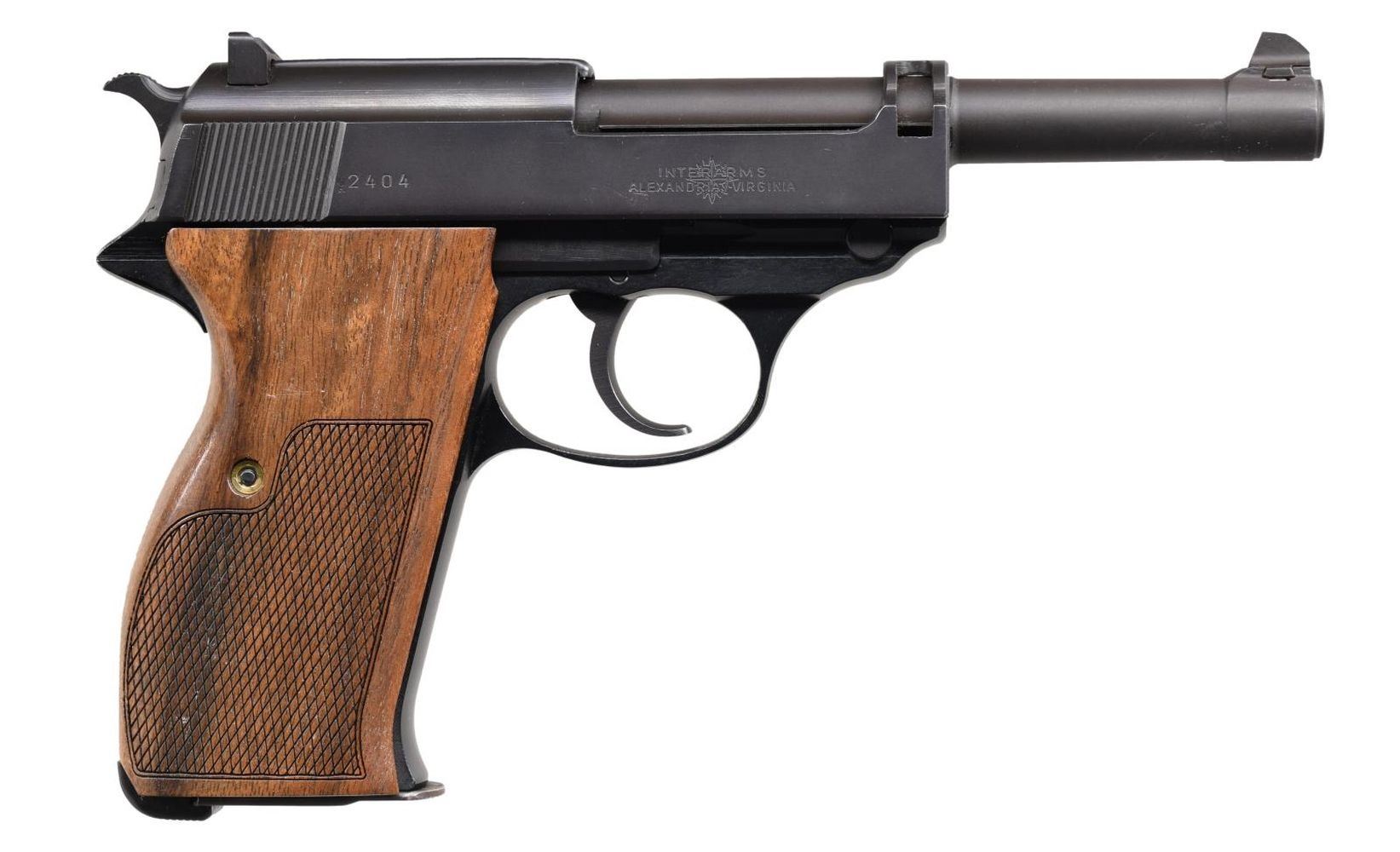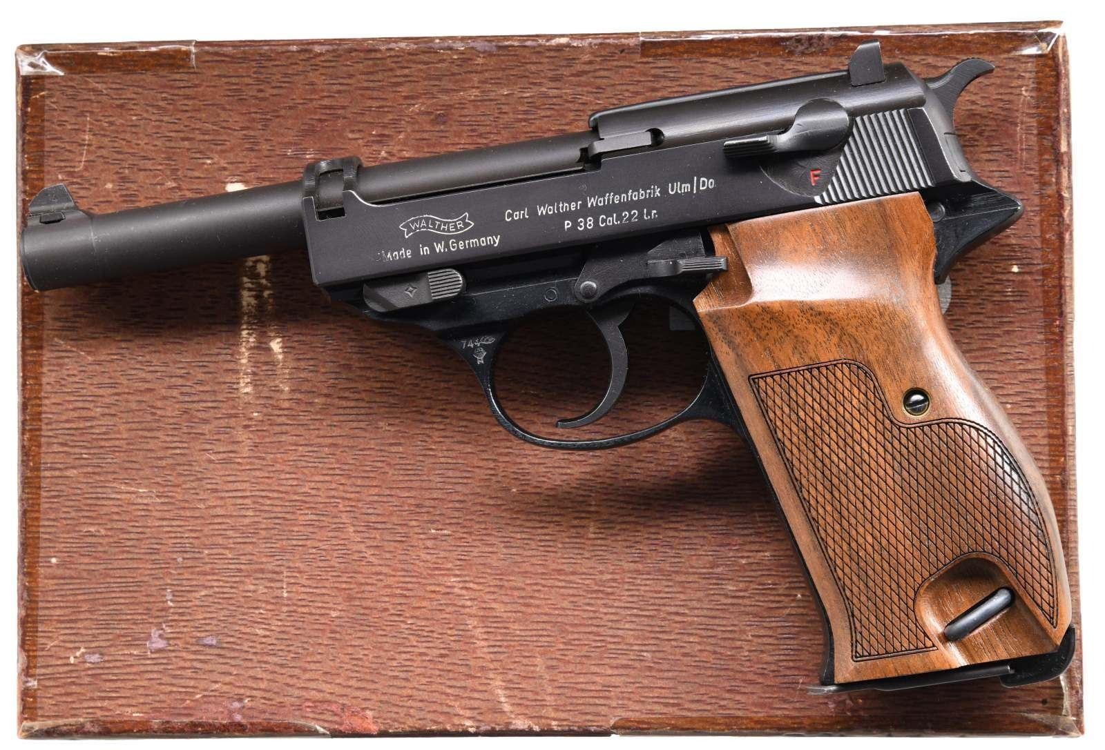 PISTOL WITH MATCHING FACTORY BOX & PAPER TEST TARGET. Cal. 22 LR. S# 2404. Bbl. 5 1/8". P.38 semi-automatic pistol chambered in .22 LR mfg. in West Germany by Walther in 1974. Left side of the slide is marked with the Walther banner logo above "Made in W. Germany", followed by markings stipulating Walther's mfg. information as well as the model and cal. designations. Right side of the slide is marked with an Eagle/N commercial nitro proof, the S#, as well as Interarms' importer information. Left side of the frame is stamped "74" followed by an Ulm Proof House antler stamp above an Eagle/N commercial nitro proof on the forward trigger guard web. Aluminum frame exhibits a black anodized finish, with the steel slide and bbl. exhibiting a matte gray finish. Frame is mounted with 2-piece checkered wood grips. MAGS: 2 10-rd. UNATTACHED ACCESSORIES: matching factory box containing a matching factory paper test target, original manual, a page from Guns & Ammo magazine's February 1976 article on the rimfire P.38, 1 spare mag., as well as a cleaning rod. CONDITION: fine, with metal components retaining bountiful amounts of their original factory finishes overall. Brilliant mirror bore, exhibiting well-defined rifling throughout. Grips are excellent overall. Box shows some taped repairs at the corners, but otherwise remains sturdy and serviceable overall. PROVENANCE: the collection of Gun Sport Ltd., owned by Jon R. Thomas. (23-3933/MLW). CURIO. $1,000-1,500.