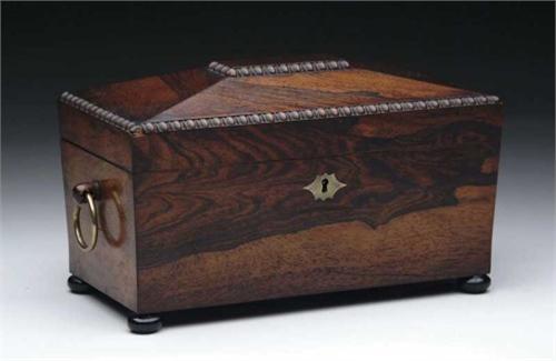 FINE REGENCY ROSEWOOD SARCOPHAGUS TEA CADDY. Beaded decorated mansard cover, brass inlaid escutcheon and end ring lifts with fine double box interior with center compartment for bowl which is not present. First quarter of the 19th Century. SIZE: 7” h x 12” l. CONDITION: Very good. 9-27898