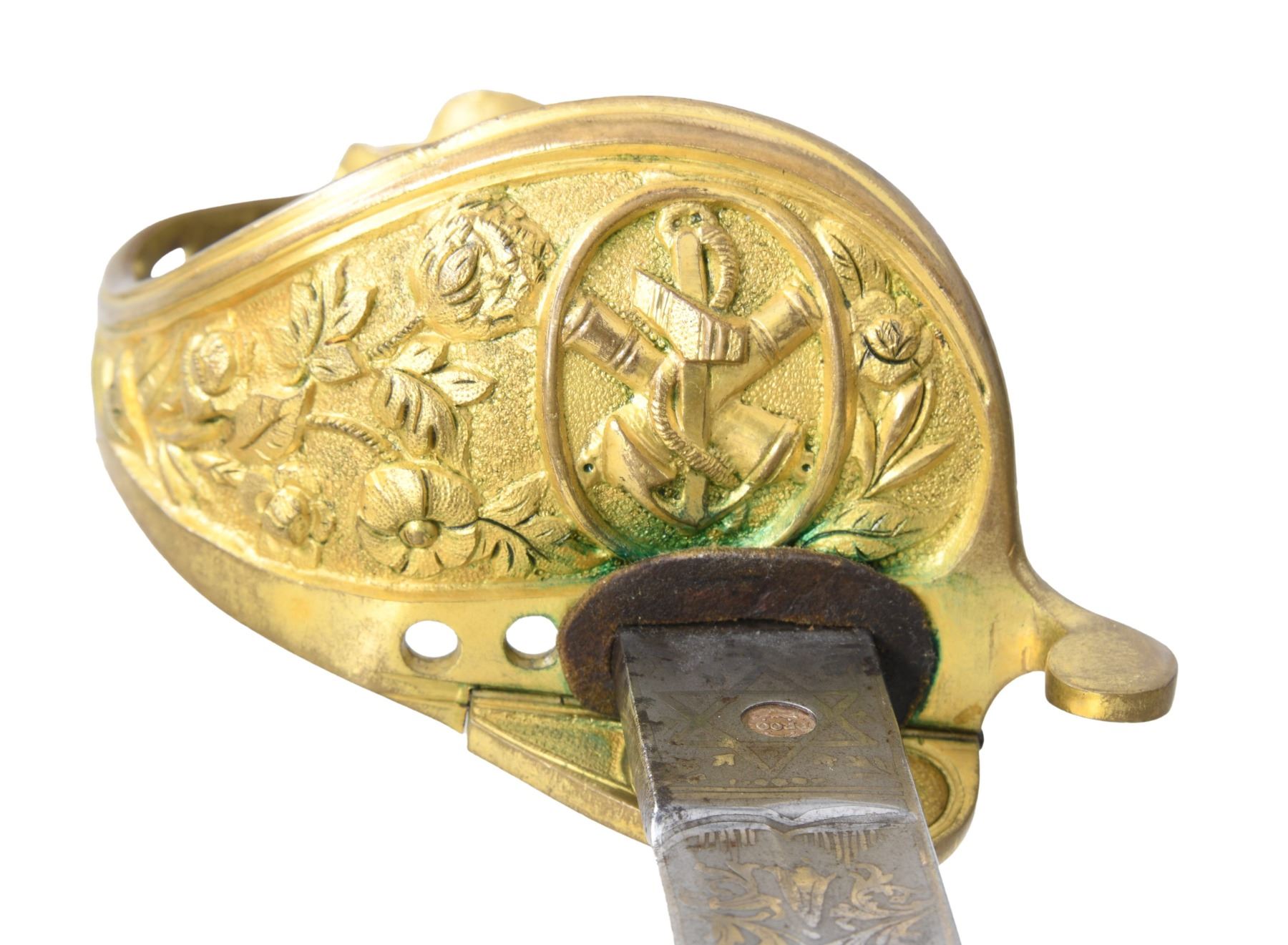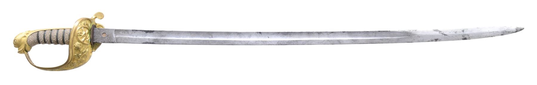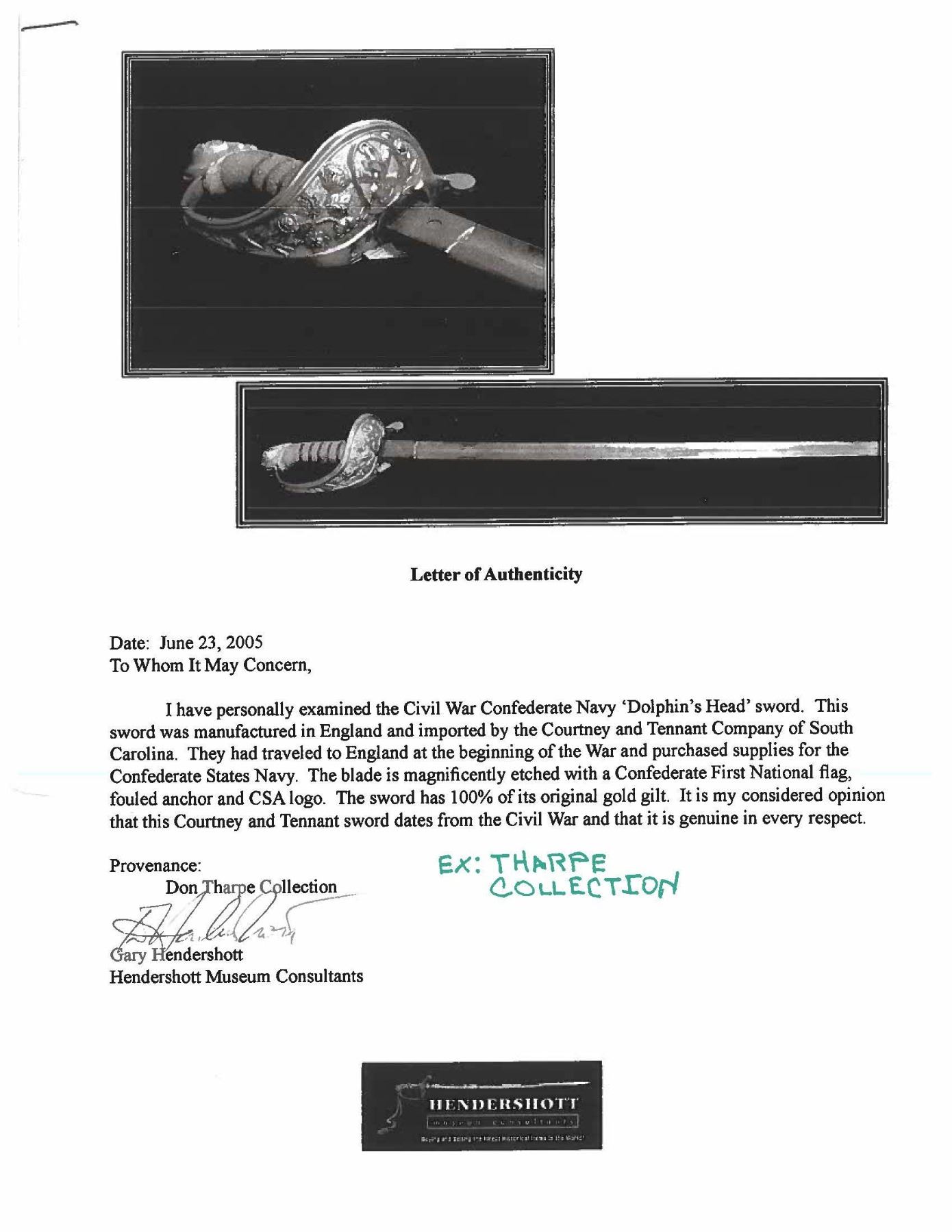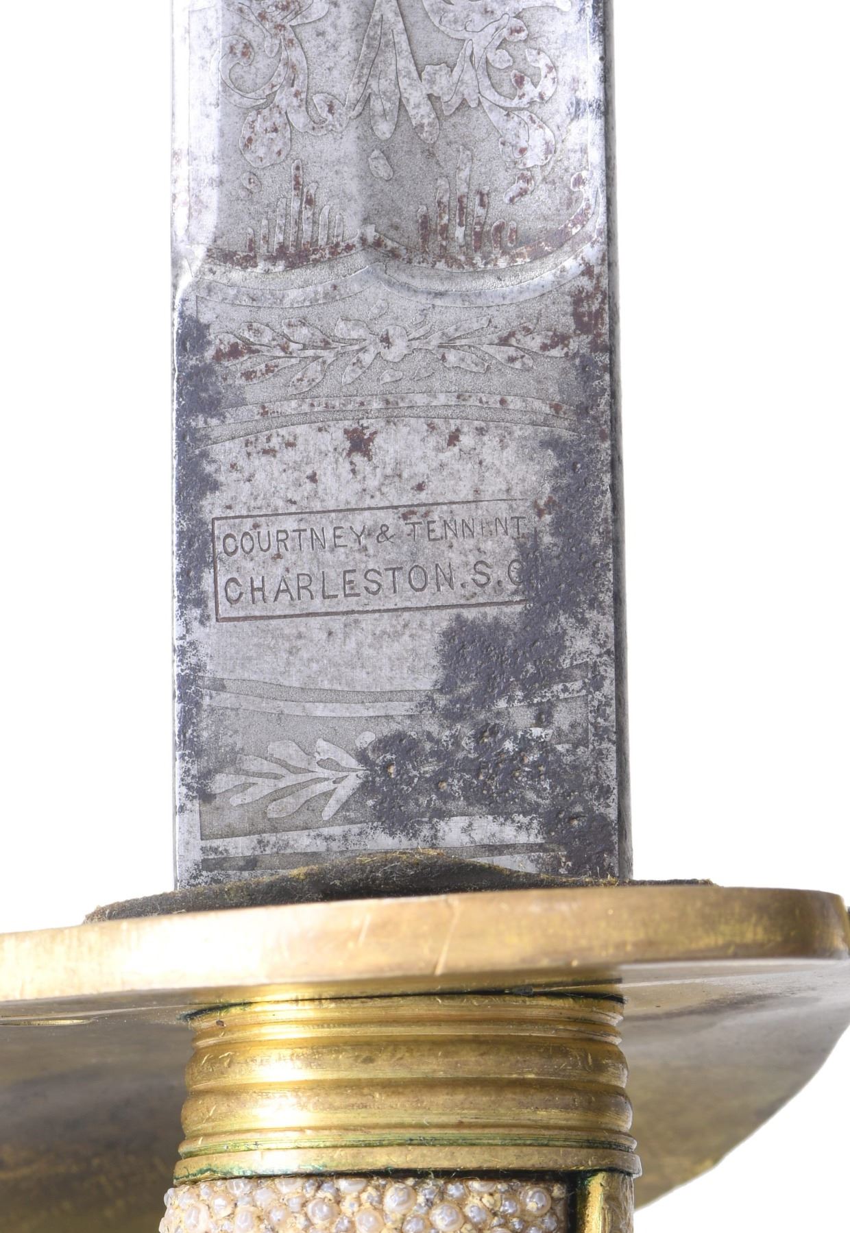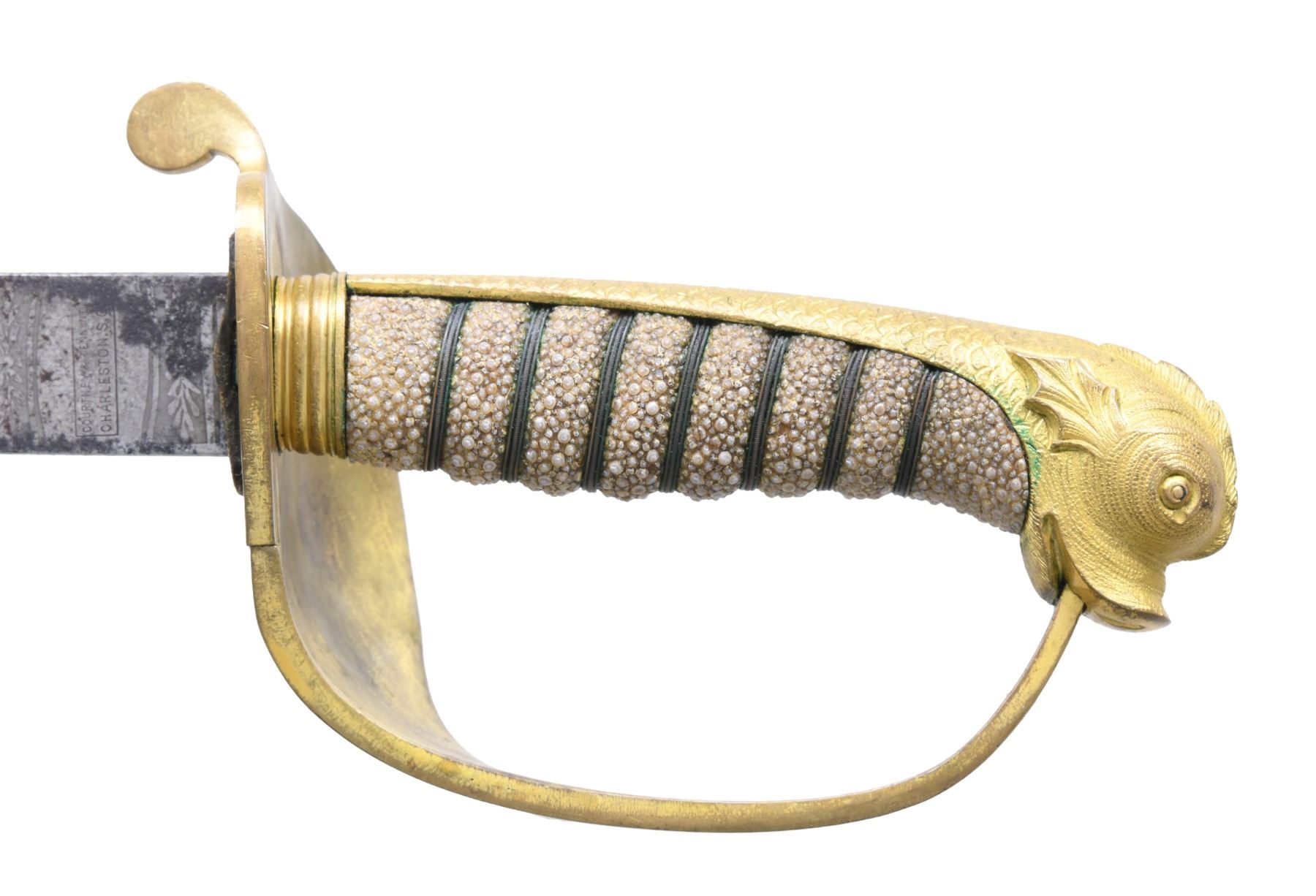 COURTNEY & TENNENT, CHARLESTON, SC. This is a fine & original example of difficult Confederate pattern to find. 30.25" blade stamped "COURTNEY & TENNENT / CHARLESTON, SC" who imported swords from England where made by Robert Mole. Patriotic etched panels show cotton bolls, Confederate naval insignia of cross cannons over fluted anchor, and a Confederate first national flag over anchor. Blade is stamped "MOLE" on top edge. The hilt on this sword is decorated in the basket with cotton and tobacco leaves surrounding an oval medallion with a fluted anchor superimposed over crossed cannons. Sharkskin grip is wrapped with triple wire protected by a backstrap representing a sea serpent or dolphin with a scaled back. This is a superior example of rare Confederate naval officer sword. UNATTACHED ACCESSORIES: letter of authenticity from Gary Hendershott, 2005: copy of catalog entry. CONDITION: fine overall. Blade is white/bright with crisp lustrous etched panels with staining and small areas of pitting. Brass hilt retains majority of its gold plating. Sharkskin grip and wire wrap are complete and tight. The original protective washer is complete and intact. PROVENANCE: Lifelong collection of Richard A. Baumann; Gary Hendershott catalog 2005. (02-23355/JS). NON-GUN. $15,000-20,000.