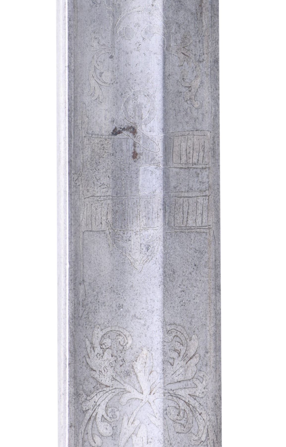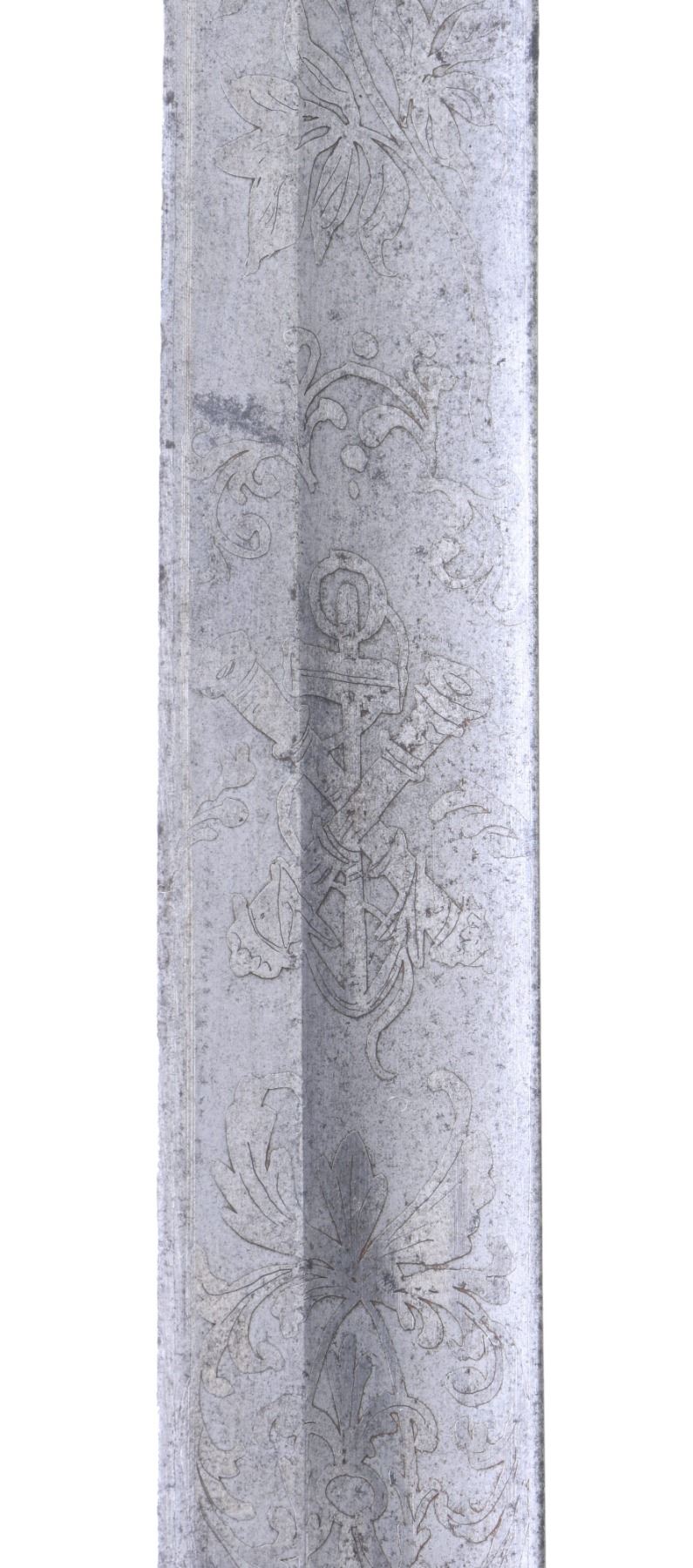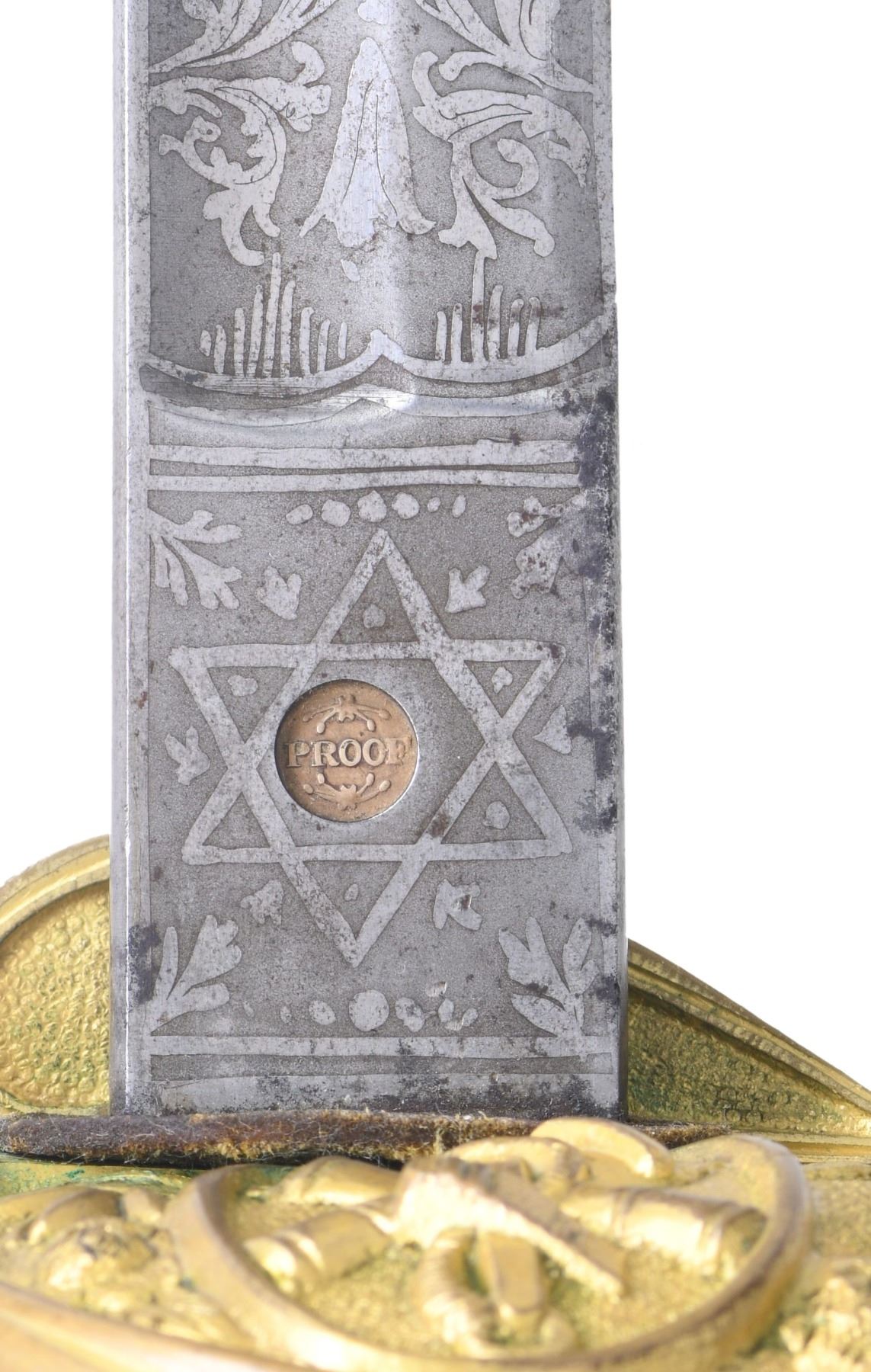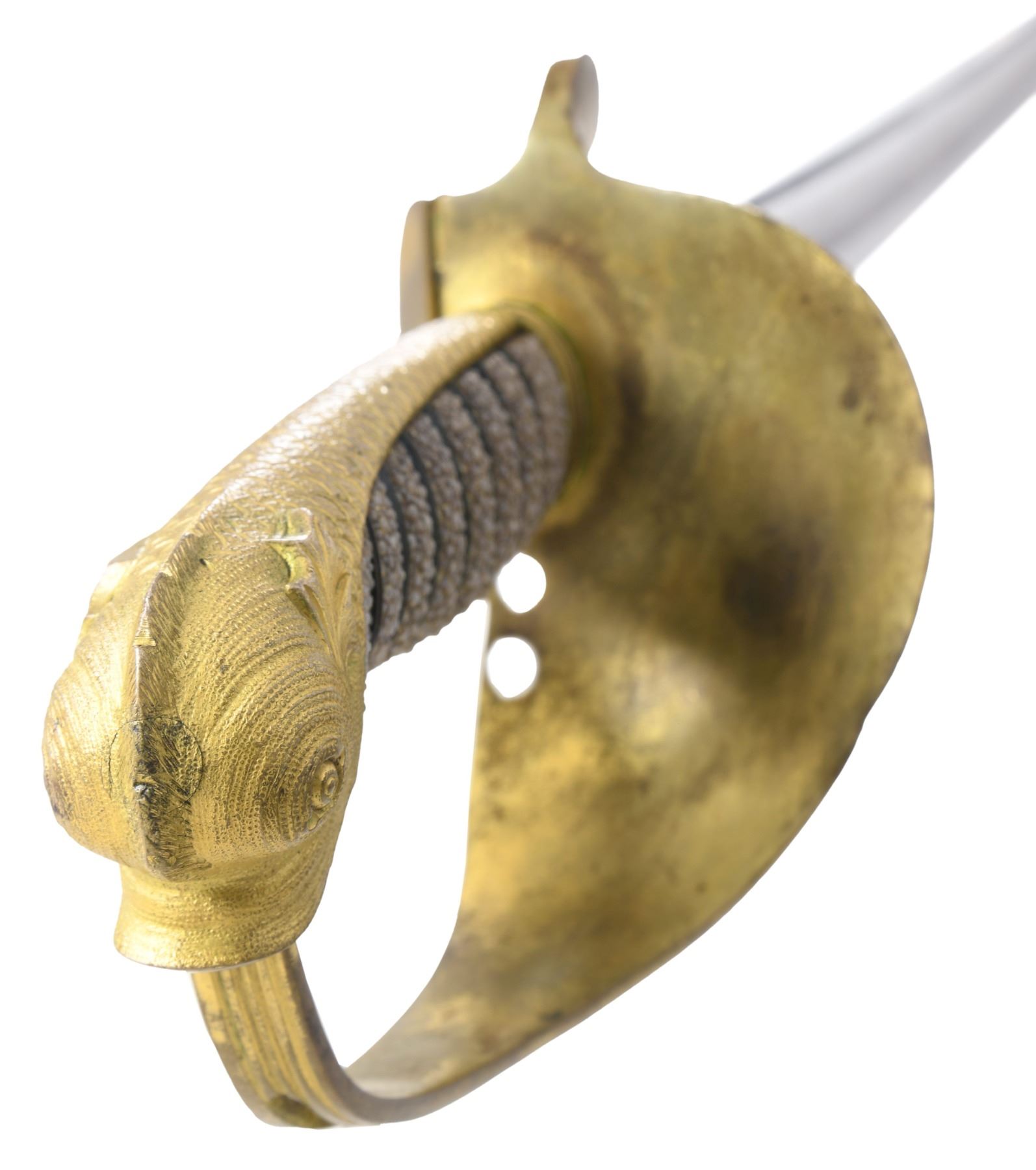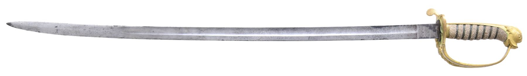 COURTNEY & TENNENT, CHARLESTON, SC. This is a fine & original example of difficult Confederate pattern to find. 30.25" blade stamped "COURTNEY & TENNENT / CHARLESTON, SC" who imported swords from England where made by Robert Mole. Patriotic etched panels show cotton bolls, Confederate naval insignia of cross cannons over fluted anchor, and a Confederate first national flag over anchor. Blade is stamped "MOLE" on top edge. The hilt on this sword is decorated in the basket with cotton and tobacco leaves surrounding an oval medallion with a fluted anchor superimposed over crossed cannons. Sharkskin grip is wrapped with triple wire protected by a backstrap representing a sea serpent or dolphin with a scaled back. This is a superior example of rare Confederate naval officer sword. UNATTACHED ACCESSORIES: letter of authenticity from Gary Hendershott, 2005: copy of catalog entry. CONDITION: fine overall. Blade is white/bright with crisp lustrous etched panels with staining and small areas of pitting. Brass hilt retains majority of its gold plating. Sharkskin grip and wire wrap are complete and tight. The original protective washer is complete and intact. PROVENANCE: Lifelong collection of Richard A. Baumann; Gary Hendershott catalog 2005. (02-23355/JS). NON-GUN. $15,000-20,000.